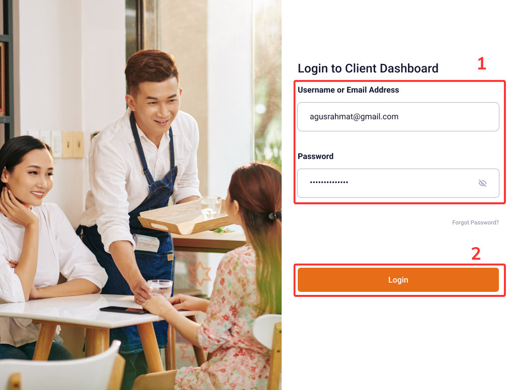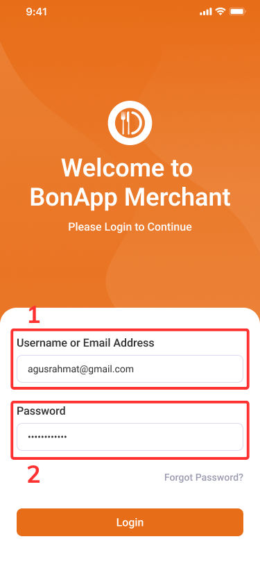 Jika pengguna sudah memiliki akun BonApp, pengguna dapat melanjutkan dengan melengkapi kolom username beserta password (1), jika sudah melengkapi pengguna dapat melanjutkan dengan memilih tombol “Login” (2).