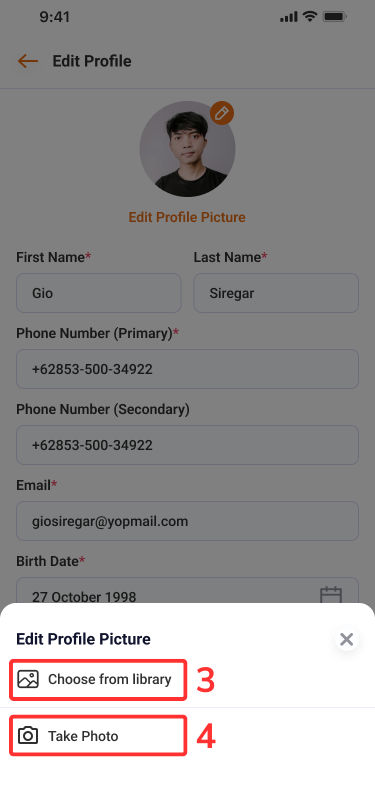 Pilih Choose from Library (3) untuk foto yang berasal dari gallery foto Anda, atau Pilih Take Photo (4) untuk membuka kamera untuk melakukan foto.