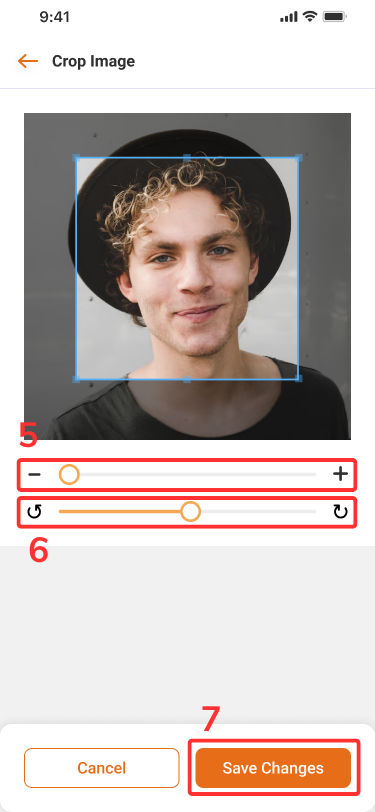 Jika sudah, pilih (5) untuk perbesar atau perkecil foto dan pilih (6) untuk memutar foto. Jika sudah selesai, pilih save (7).