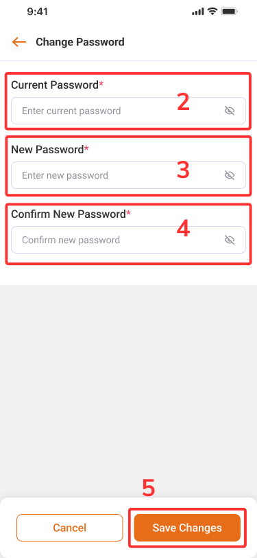 Isi password saat ini (2) > Isi password baru (3) > Isi sekali lagi password baru (4) > Save Changes (5)