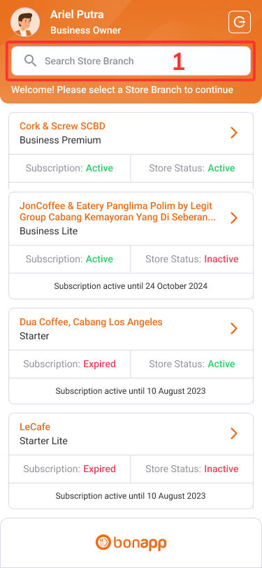 Jika Anda ingin mencarinya dengan mudah, pilih search store branch (1) lalu ketik store branch yang ingin dicari.