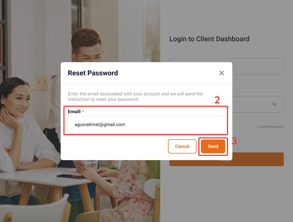 Setelah itu, Anda dapat mengisi alamat email Anda (2) dan apabila sudah selesai Anda dapat menekan tombol “Reset (3)”.