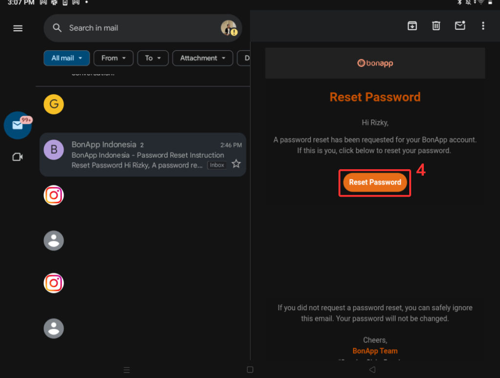 Kemudian, Anda dapat memerika pesan masuk pada alamat email Anda. Setelah itu Anda dapat menekan tombol “Reset Password (4)”.