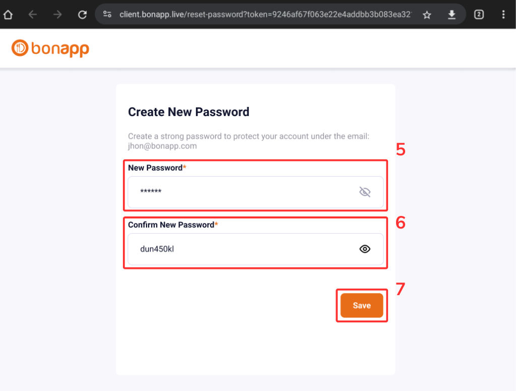 Anda dapat memasukkan password baru pada “New Password (5)” dan masukkan ulang password baru Anda pada “Confirm New Password (6)”. Apabila sudah selesai, Anda dapat menekan tombol “Save (7)”.