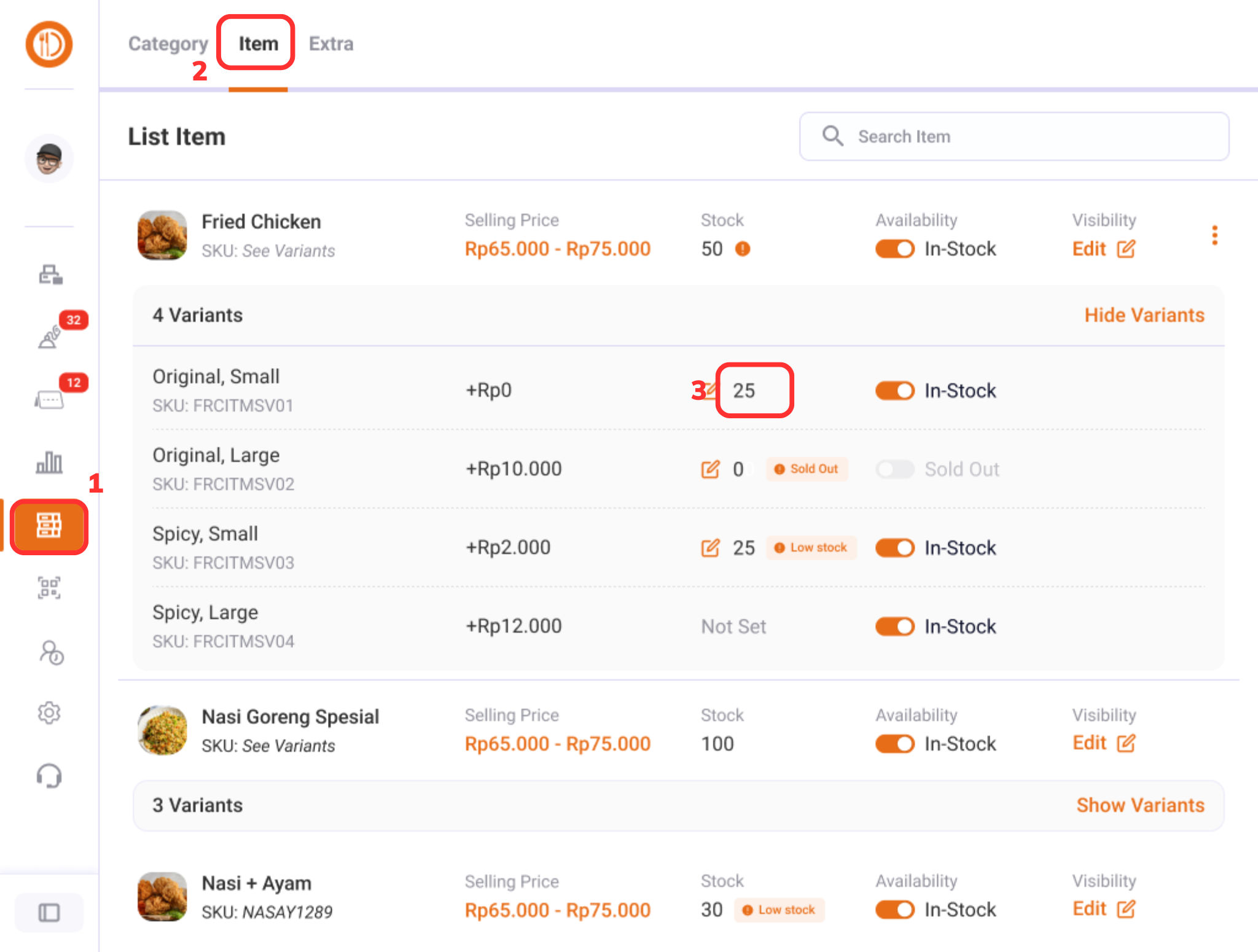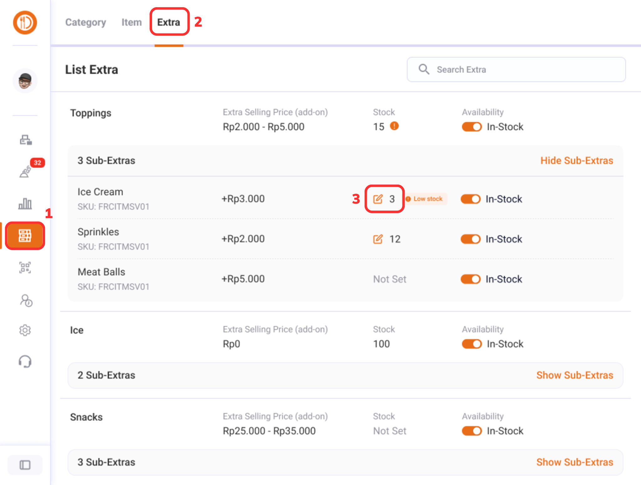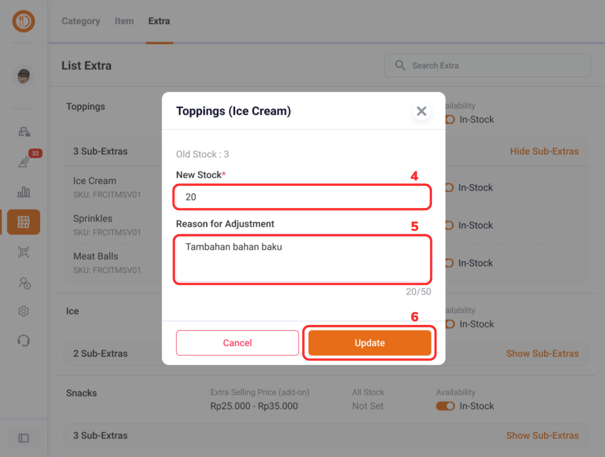 Mengatur Stok Item / Extra