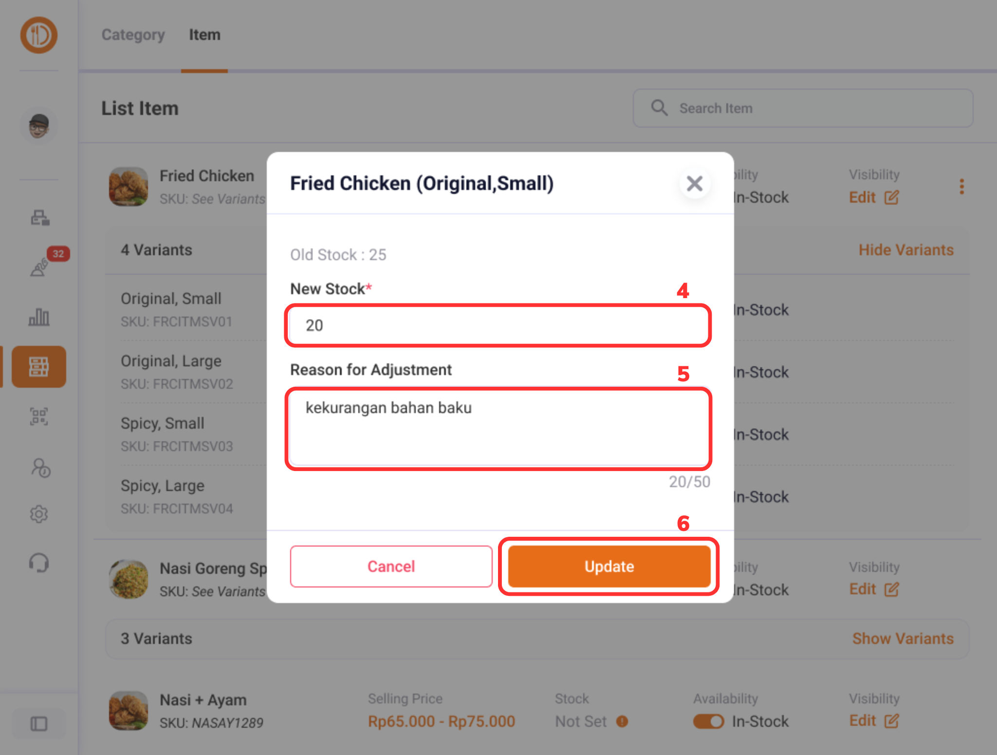 Lalu akan muncul pop up box yang berisi kolom “New Stock (4)” untuk mengatur jumlah stok dan kolom “Reason Update (5)” untuk memberikan keterangan pada stok yang akan di-update. Kemudian setelah semua terisi pilih “Update (6)”.