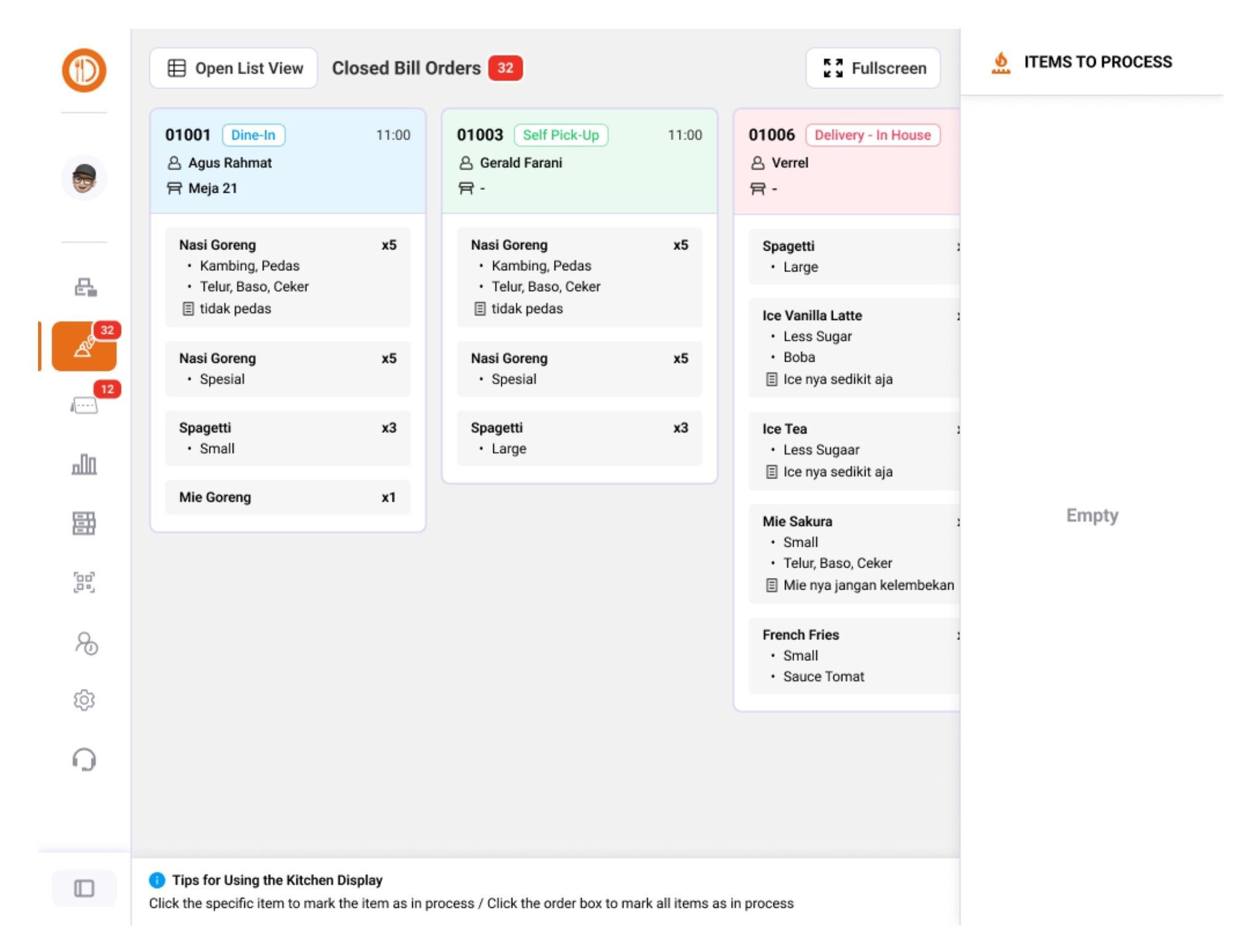 Dengan ini, kitchen bisa melihat item yang sedang di proses masak dan item yang belum dimasak.