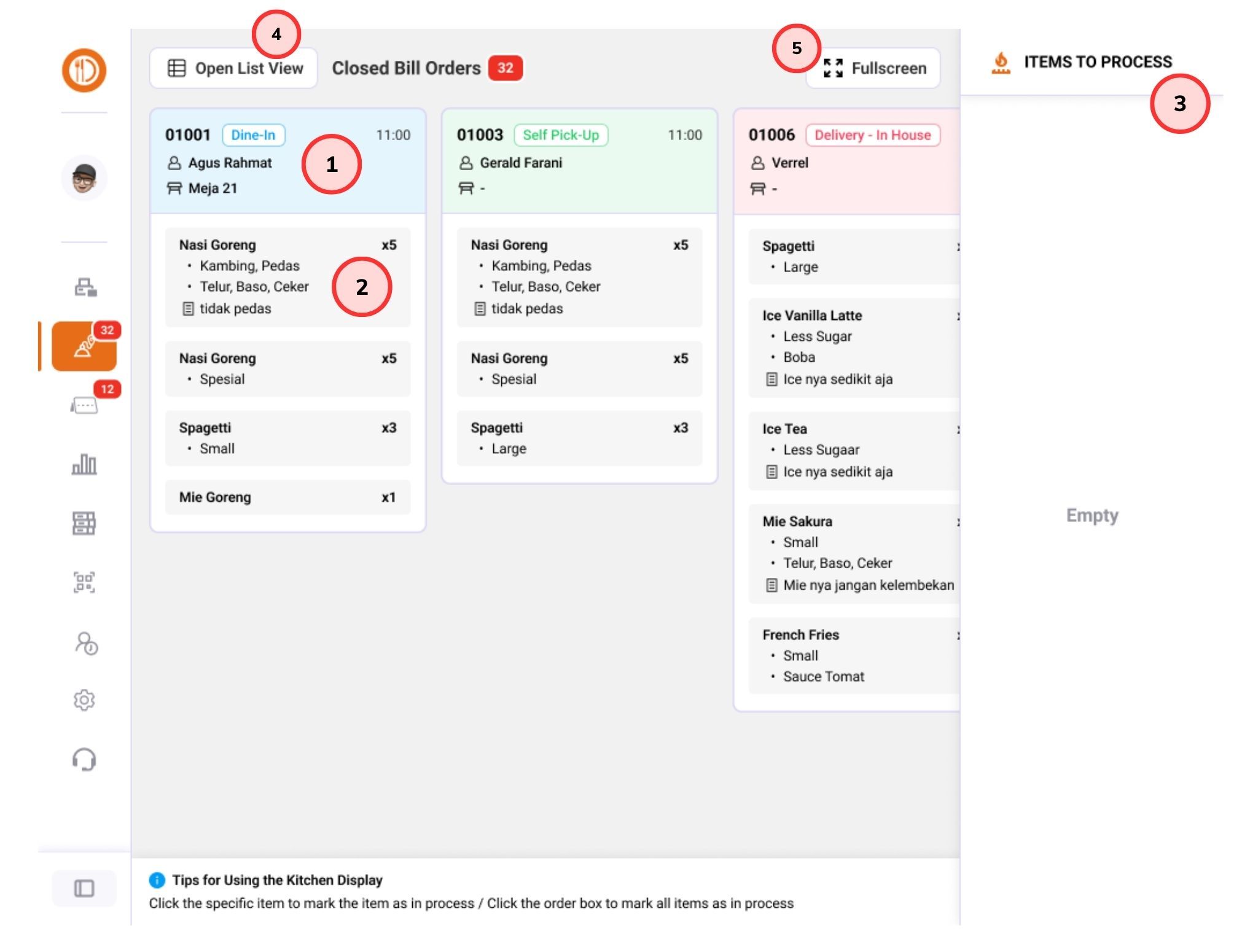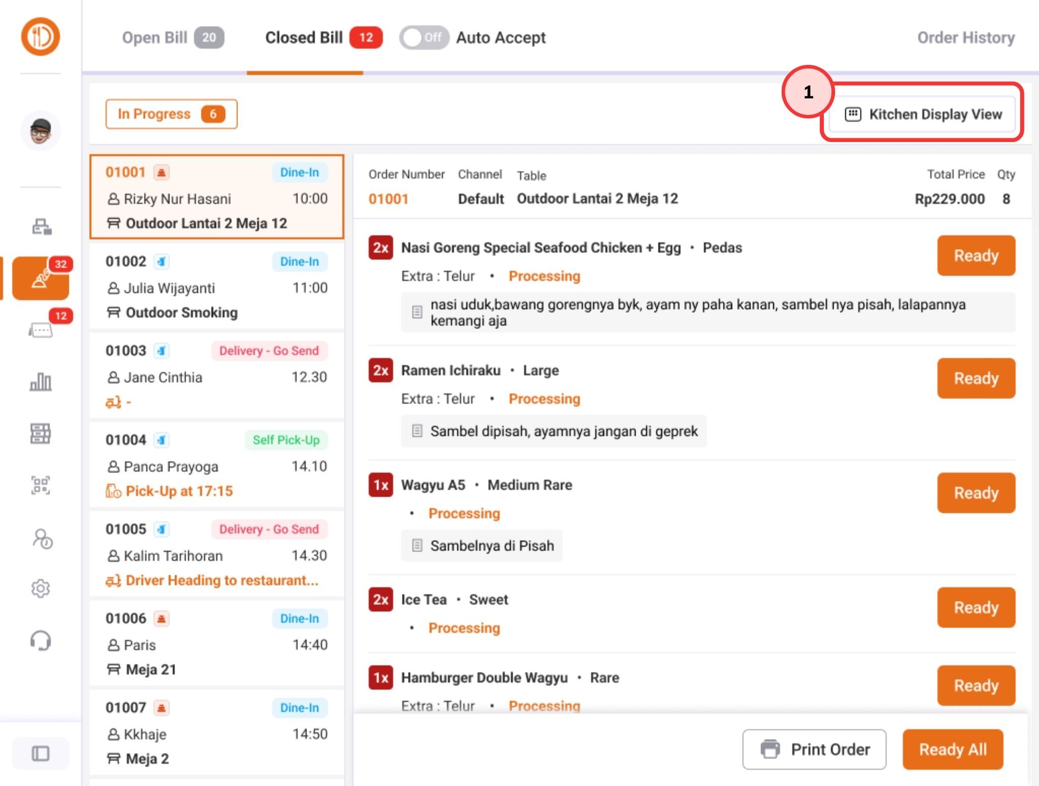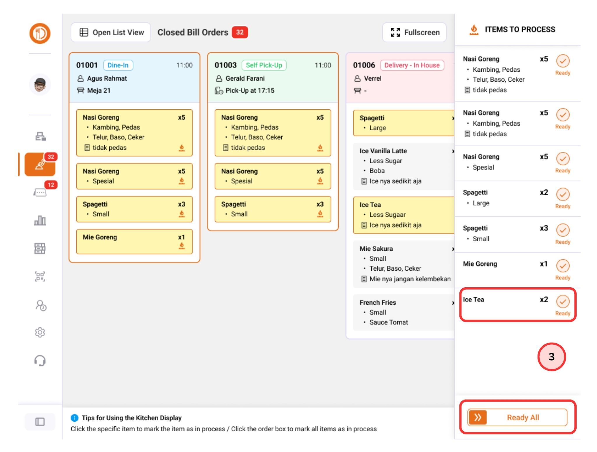 Setelah item sudah dimasak, pilih Ready (3) pada item tersebut atau Ready All (3) untuk menandakan semuanya sudah dimasak.