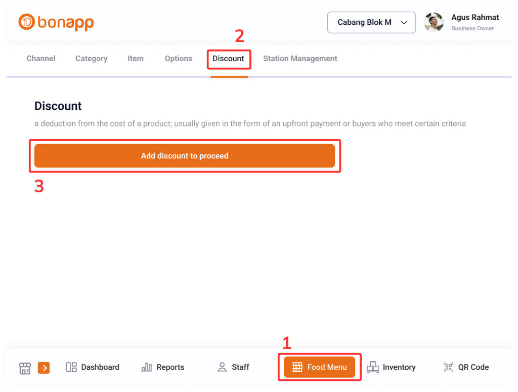 Pilih “Food Menu (1)” > “Discount (2)” > “Add Discount to Proceed (3)”.