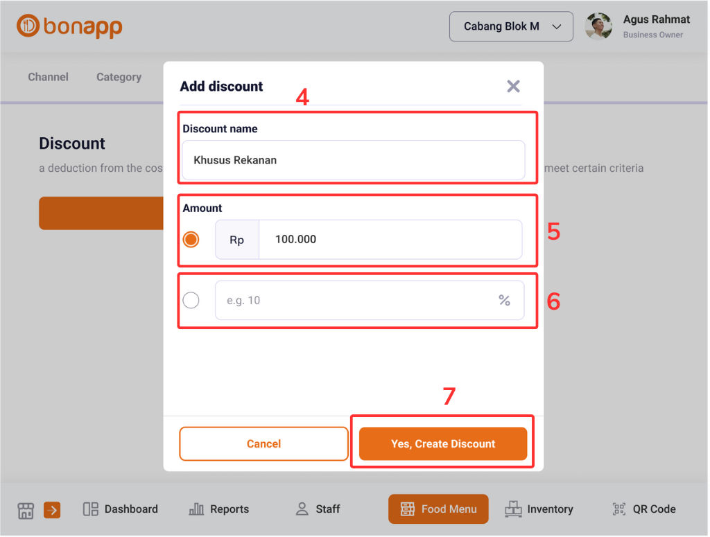 Isi nama diskon pada “Discount Name (4)” > “Jumlah Diskon Nominal (5) atau Persentase (6)” > “Yes, Create Discount (7)”.