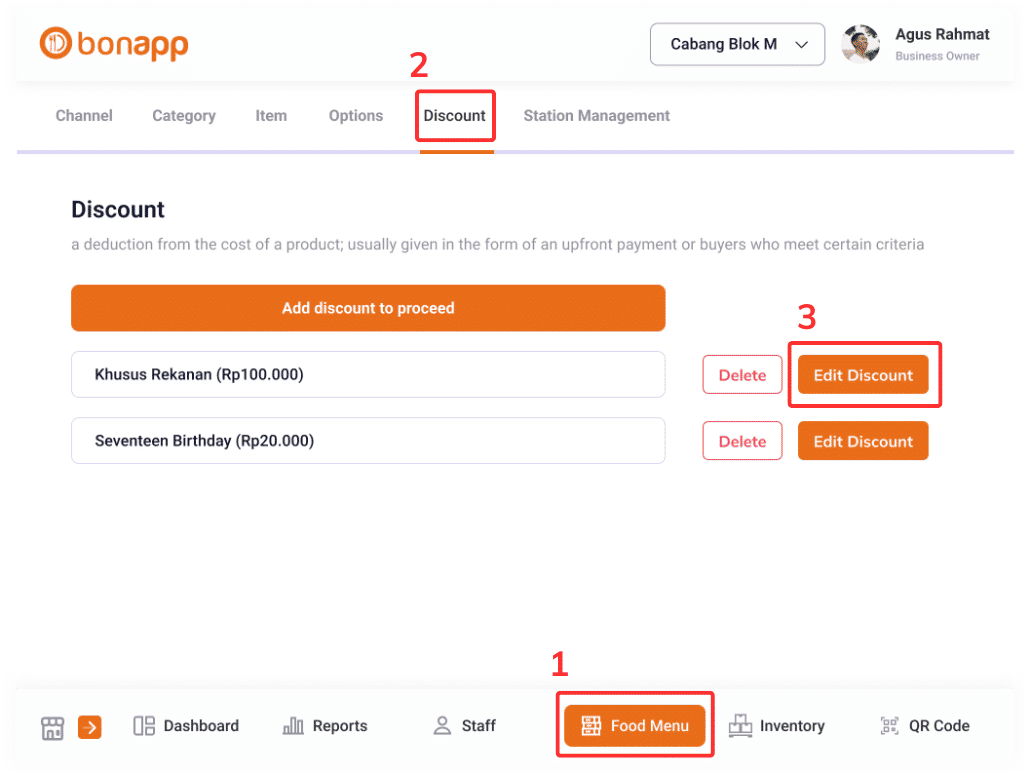 Pilih “Food Menu (1)” > “Discount (2)” > “Edit Discount (3)”