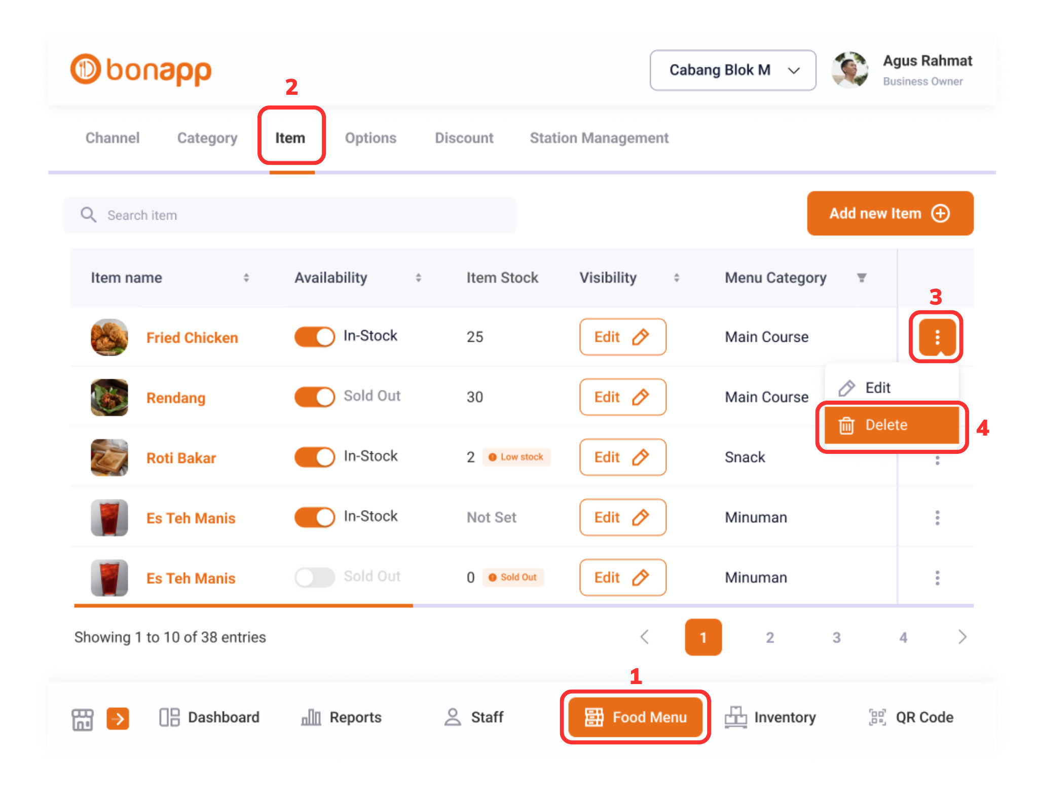 Untuk menghapus item, Anda dapat memilih “Food Menu (1)” > “Item” > “Menu Tiga Titik (3)” > “Delete (4)”.
