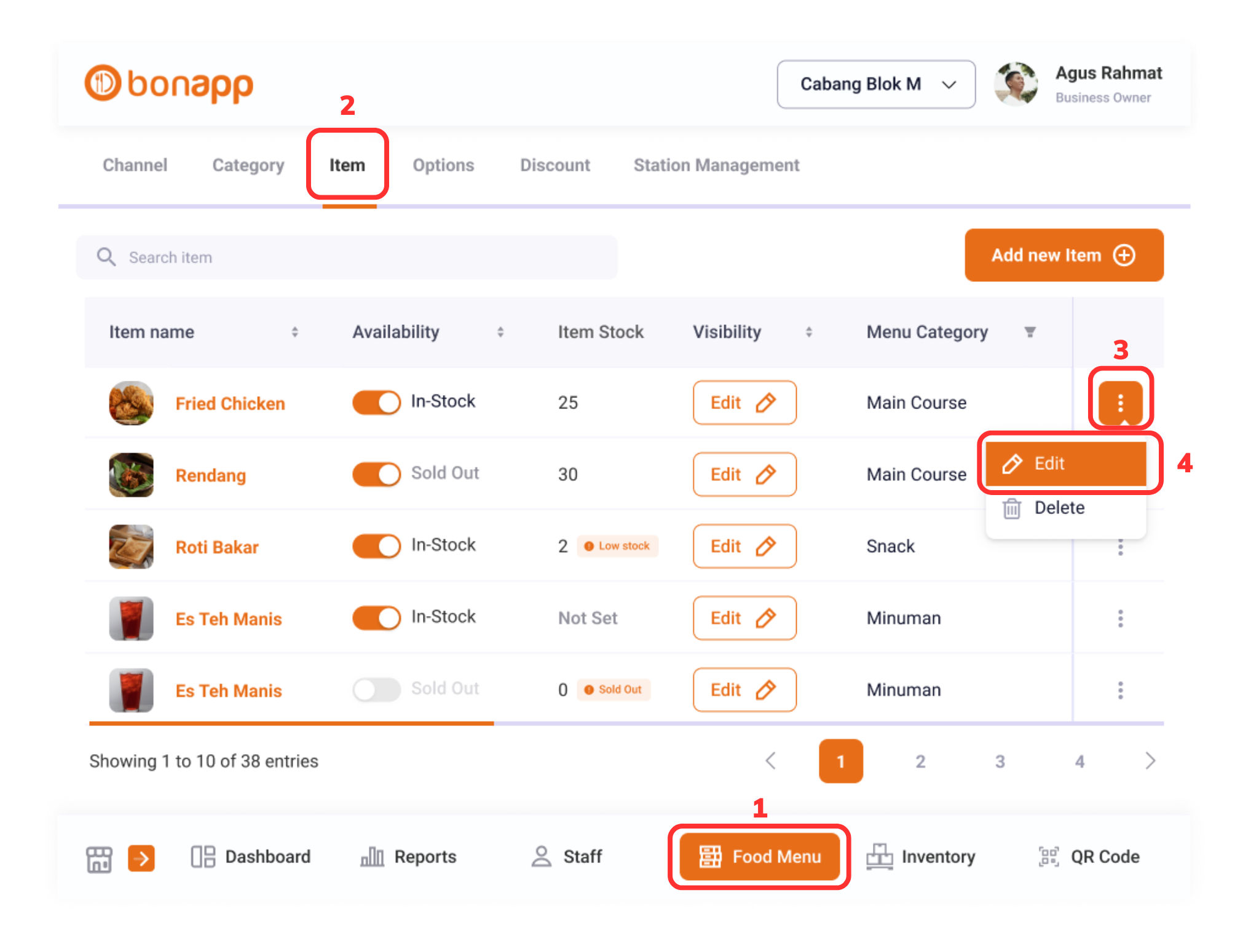 Untuk mengedit item, Anda dapat memilih “Food Menu (1)” > “Item (2)” > “Menu Titik Tiga (3)” > “Edit (4)”.