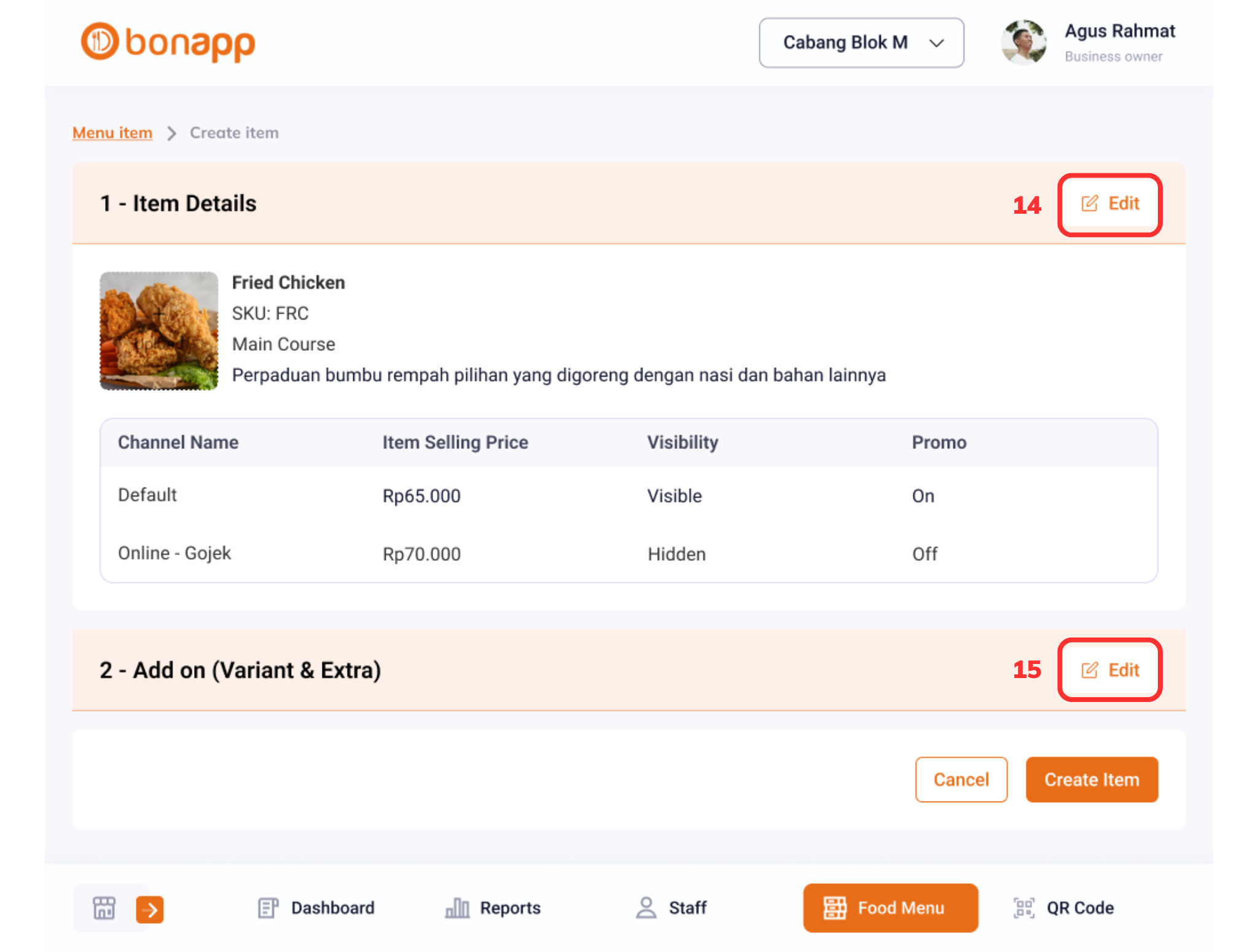 Detail item berhasil disimpan. Merchant juga dapat mengedit detail item yang telah dibuat dengan memilih “Edit (14)” pada kolom yang tersedia. Selanjutnya, merchant dapat menambahkan Add on (Varian & Extra) dengan memilih “Edit (15)”.
