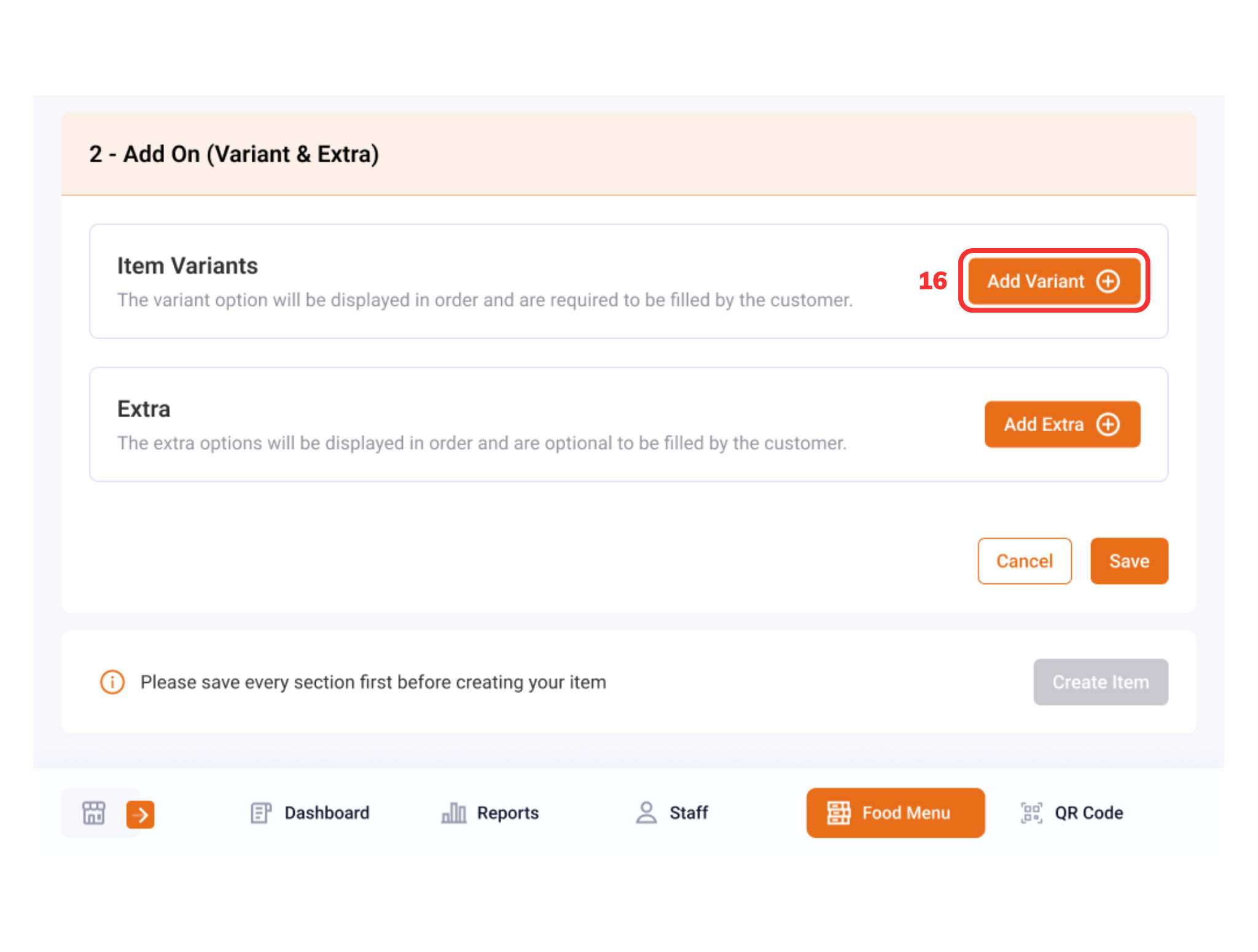 Kemudian akan tampil pilihan “Add Variant (16)” untuk menambahkan variant baru di menu item yang telah dibuat.