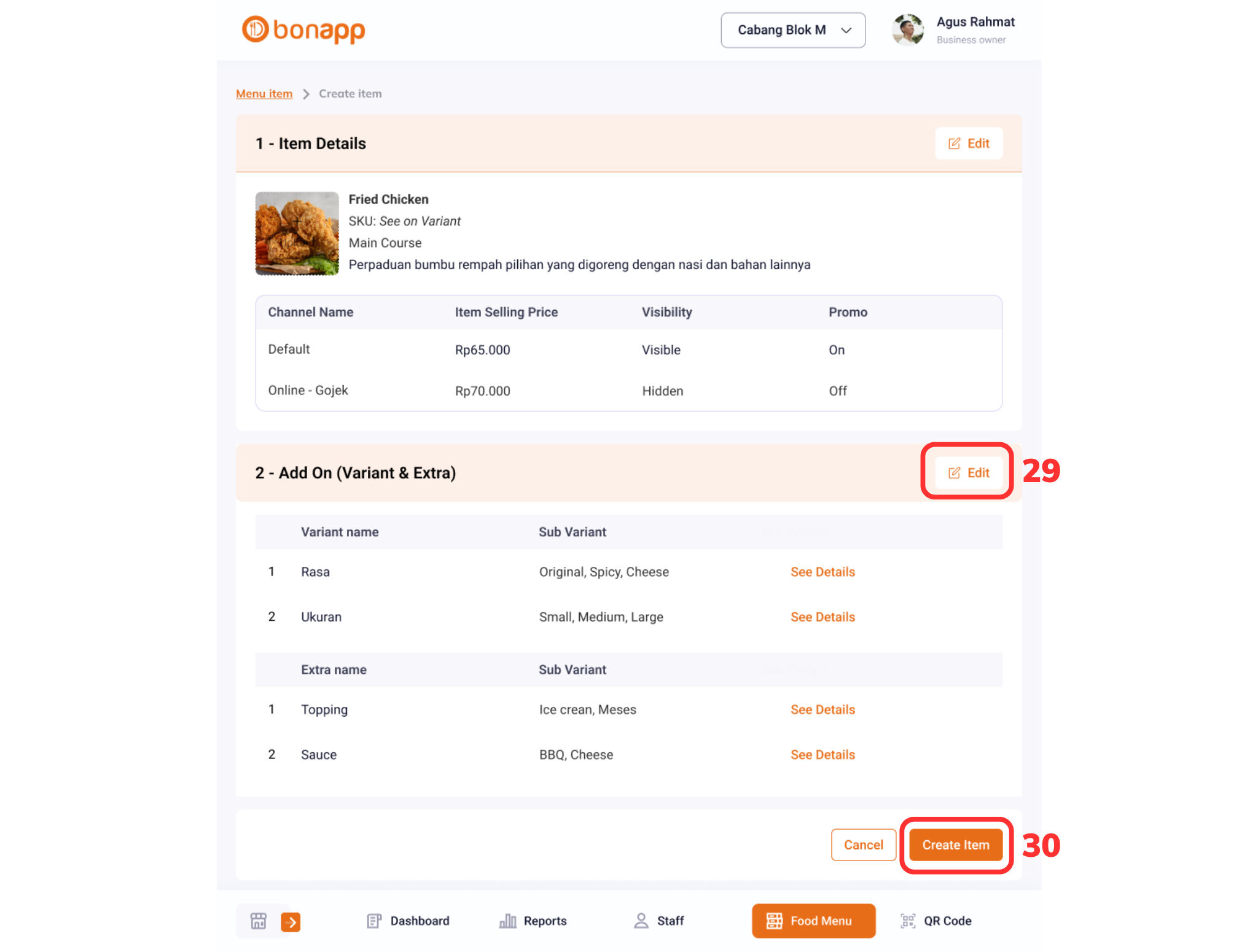 Merchant juga masih bisa mengedit Add-on (Variant & Extra) yang sudah dibuat dengan memilih menu “Edit (29)”. Setelah semua data selesai dibuat, Merchant dapat memilih “Create Item (30)” untuk menyimpan semua data item yang telah dibuat dan item berhasil dibuat.