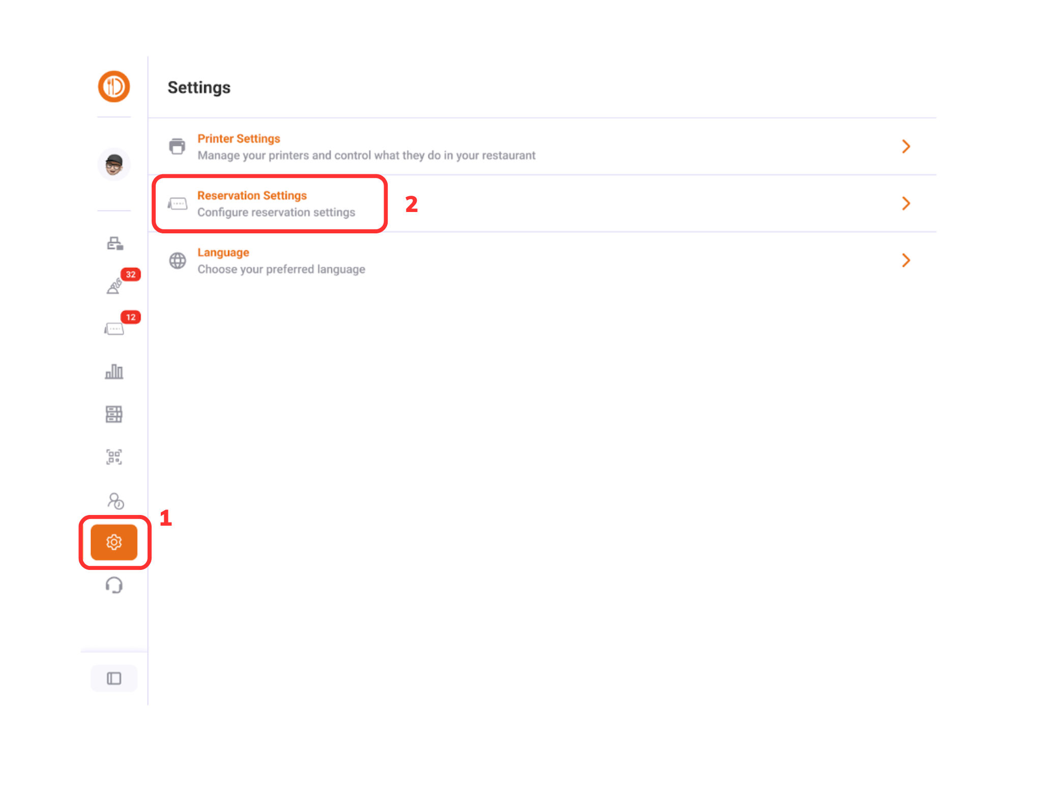 Anda dapat mengatur halaman Konfigurasi Reservasi melalui BonApp Merchant App. (Pastikan Anda sudah login di BonApp Merchant App.) Anda dapat membuka menu Settings (1) pada tampilan menu sebelah kiri. Pilih Reservation Settings (2).
