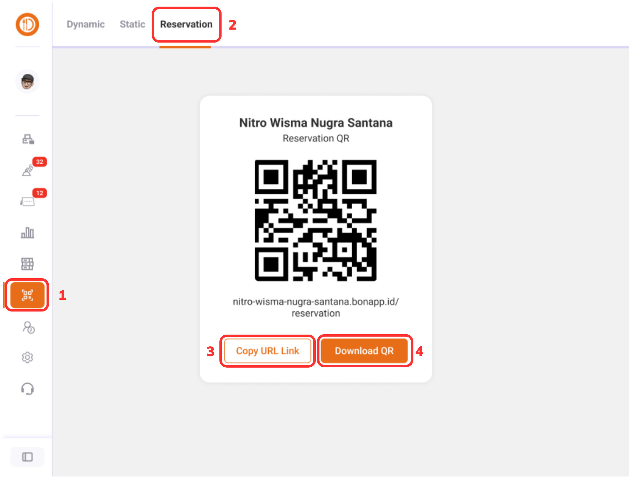 Anda dapat mendownload QR reservasi agar customer dapat mengakses fitur dengan membuka menu di bagian kiri, kemudian pilih QR Menu (1). Lalu, pilih tab Reservation (2). Setelah itu, Anda dapat menyalin tautan dengan memilih Copy URL Link (3) atau mendownload QR dengan mengklik Download QR (4).