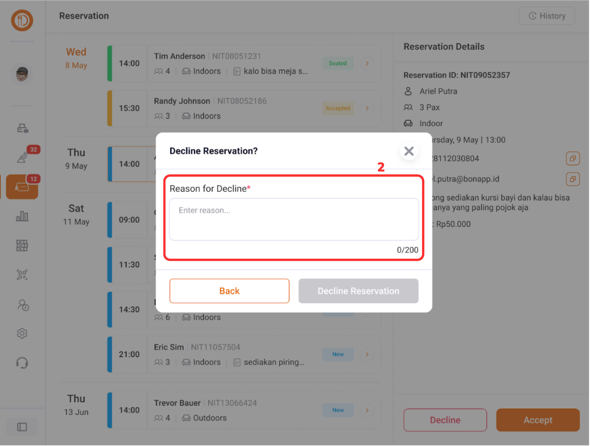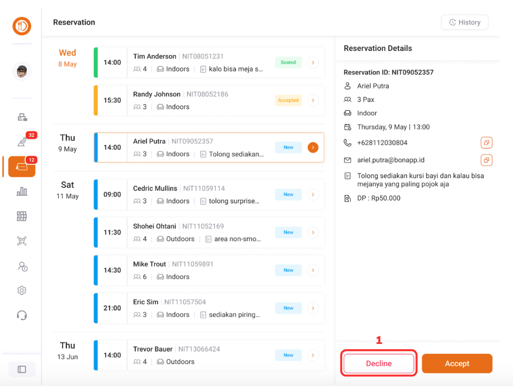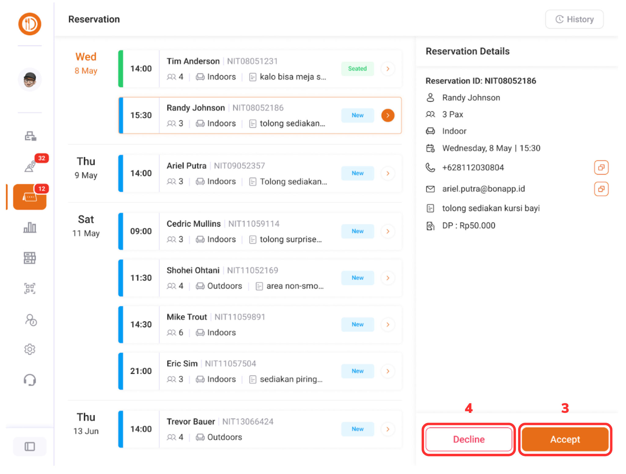 Untuk menerima reservasi, Merchant dapat mengklik tombol “Accept (3)” pada kolom detail reservasi. Untuk membatalkan reservasi, Anda dapat mengklik tombol “Decline (4)”.