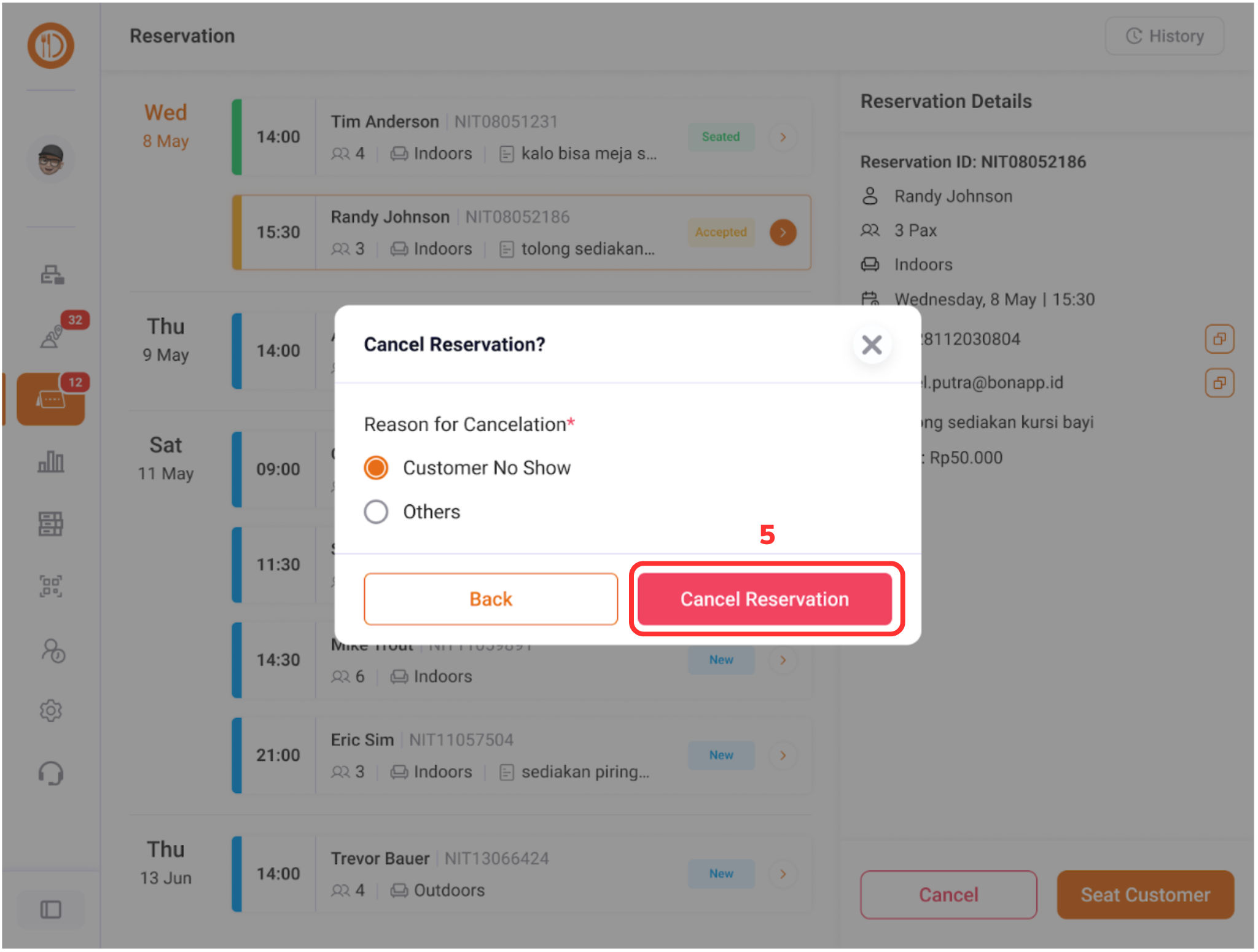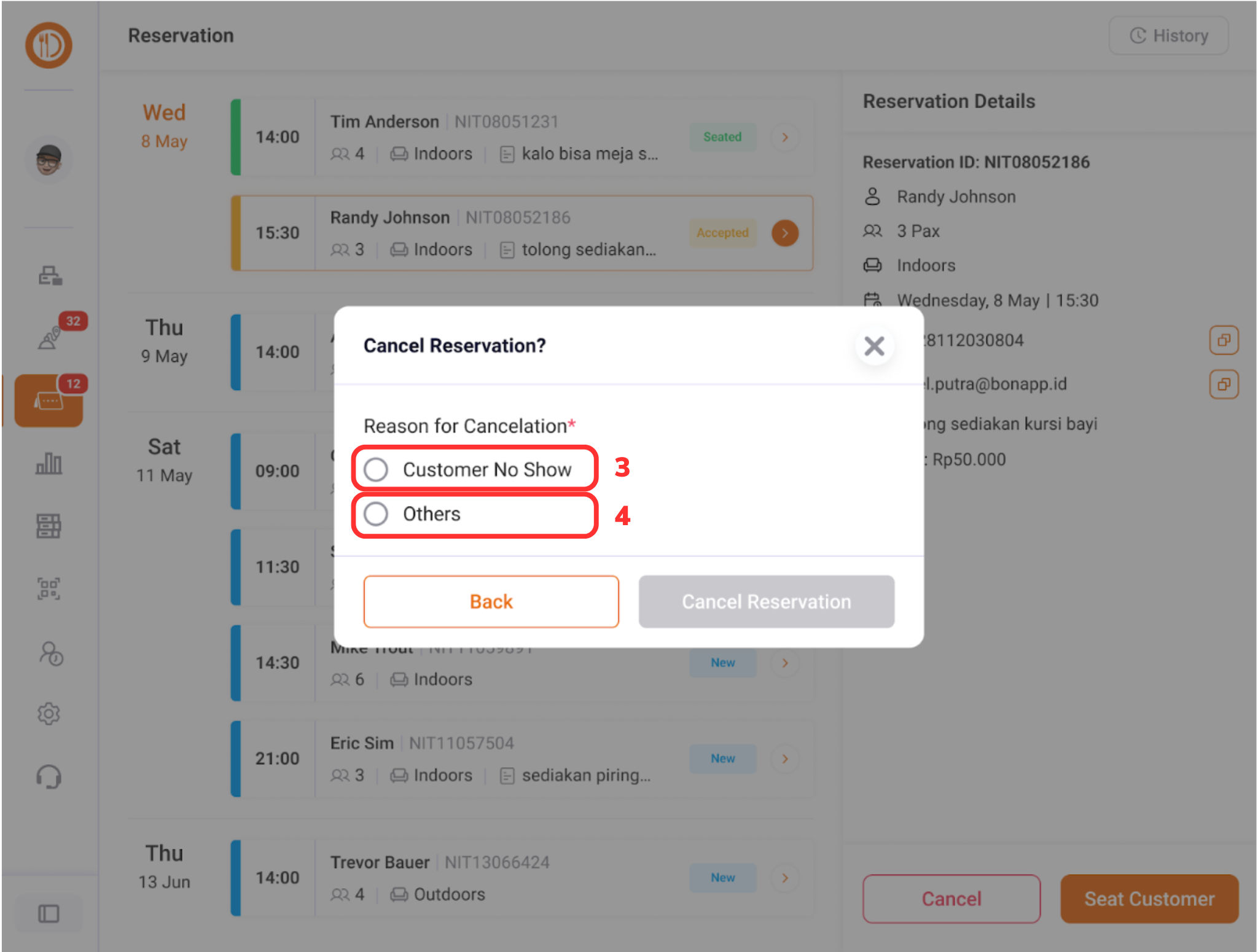 Anda dapat memilih alasan pembatalan reservasi dengan mengklik tombol Customer No Show (3) untuk customer yang tidak datang pada jam reservasi, atau klik tombol Others (4) untuk alasan lainnya.