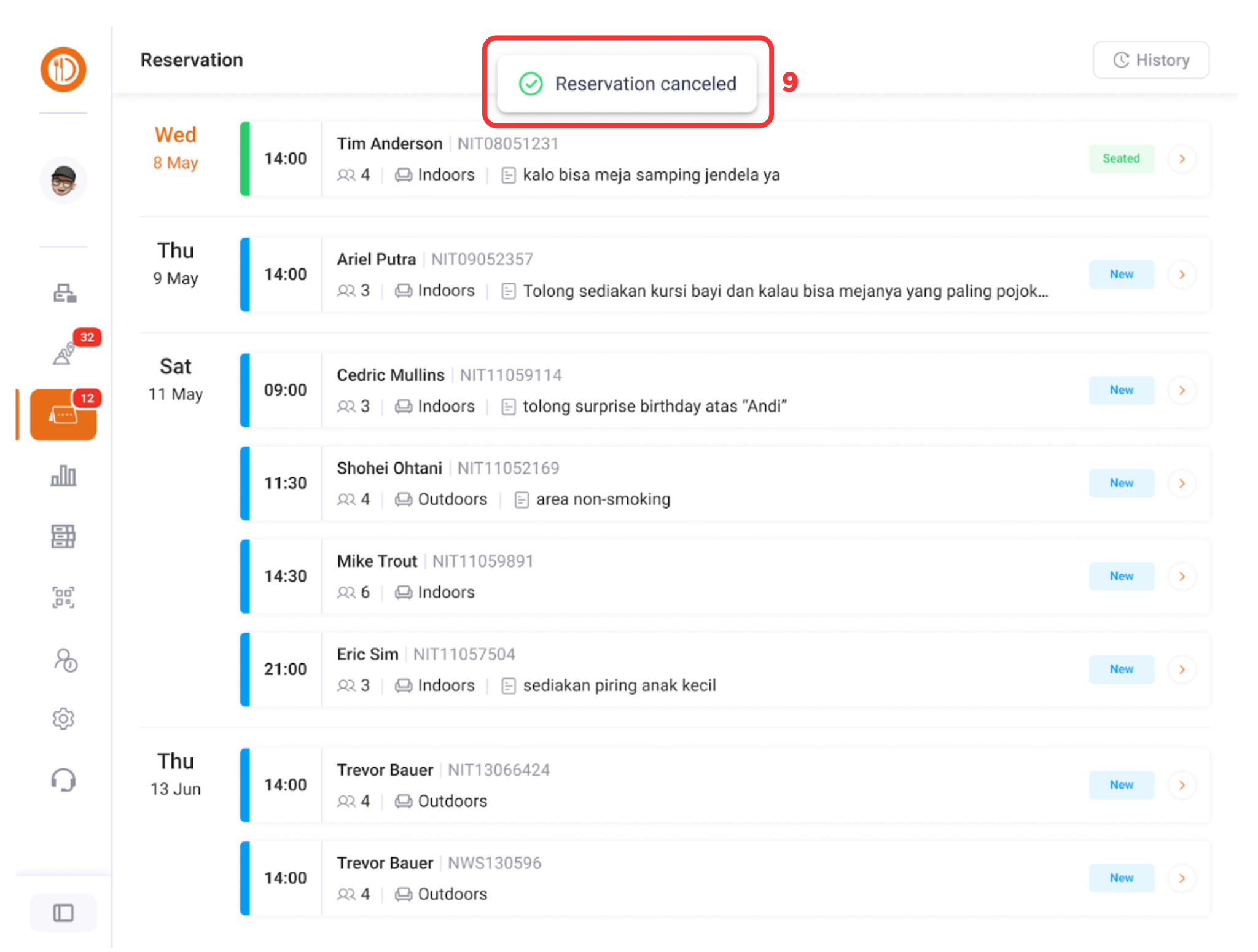 Notifikasi Reservation Canceled (9) akan muncul jika reservasi berhasil dibatalkan.