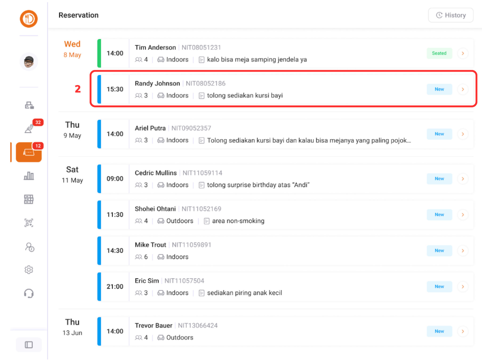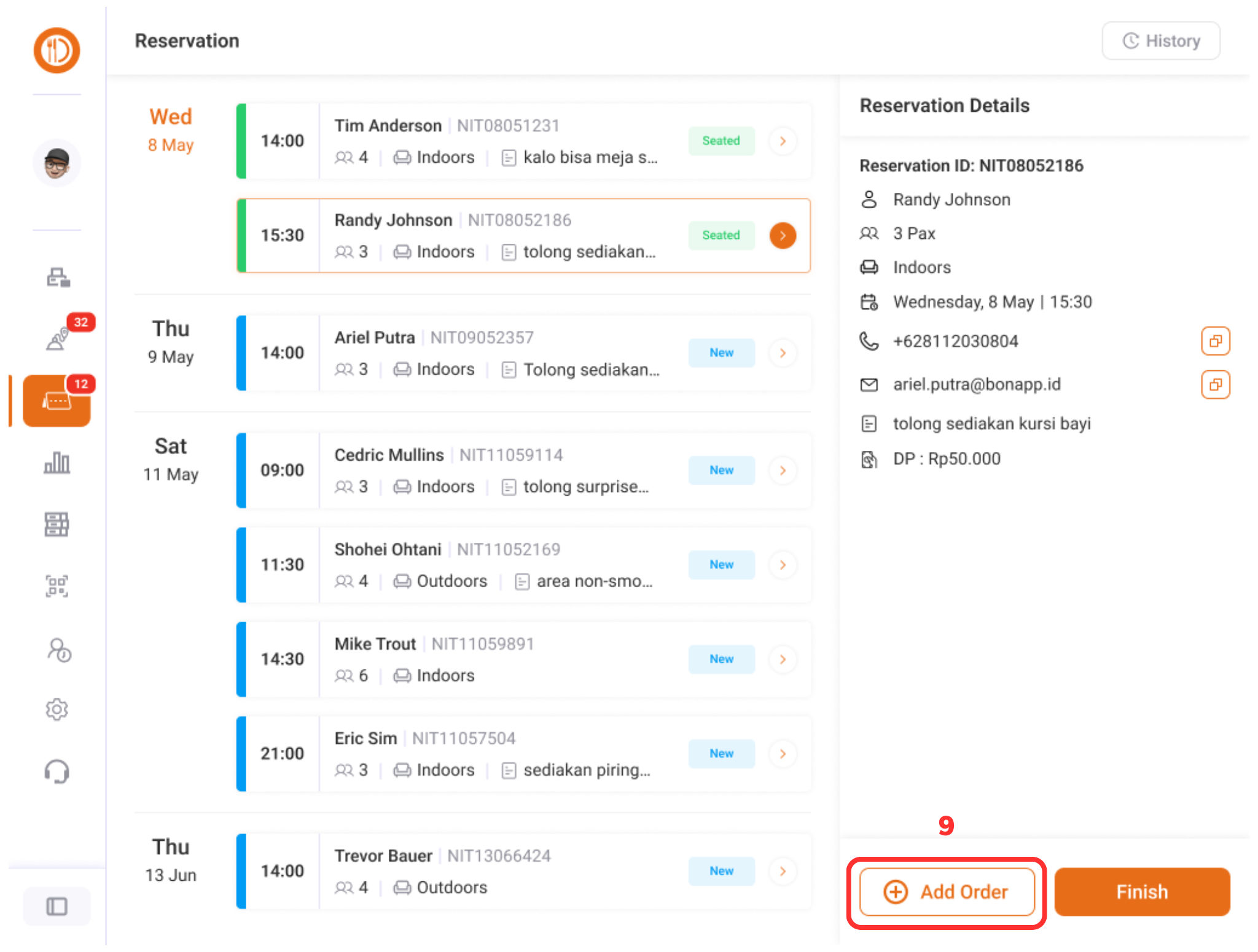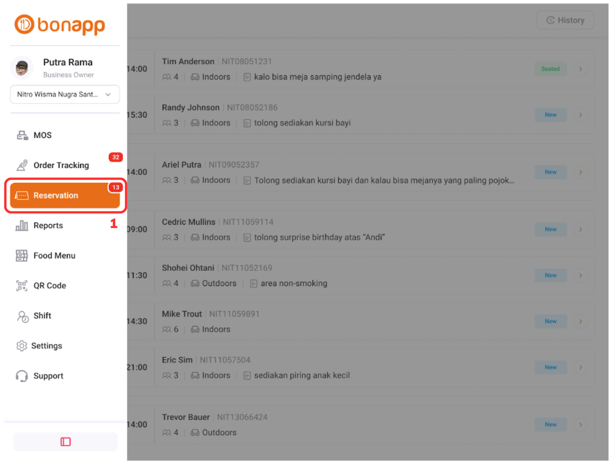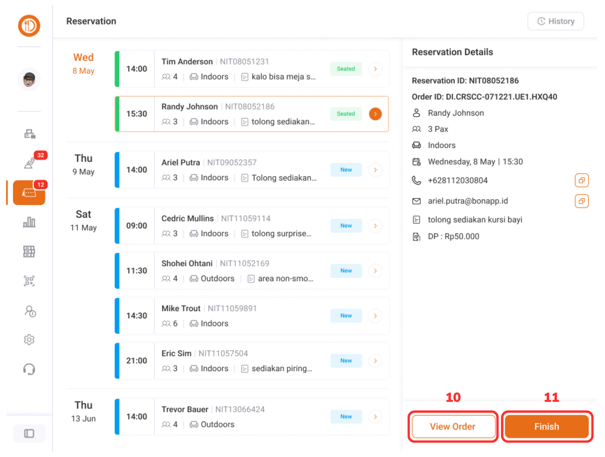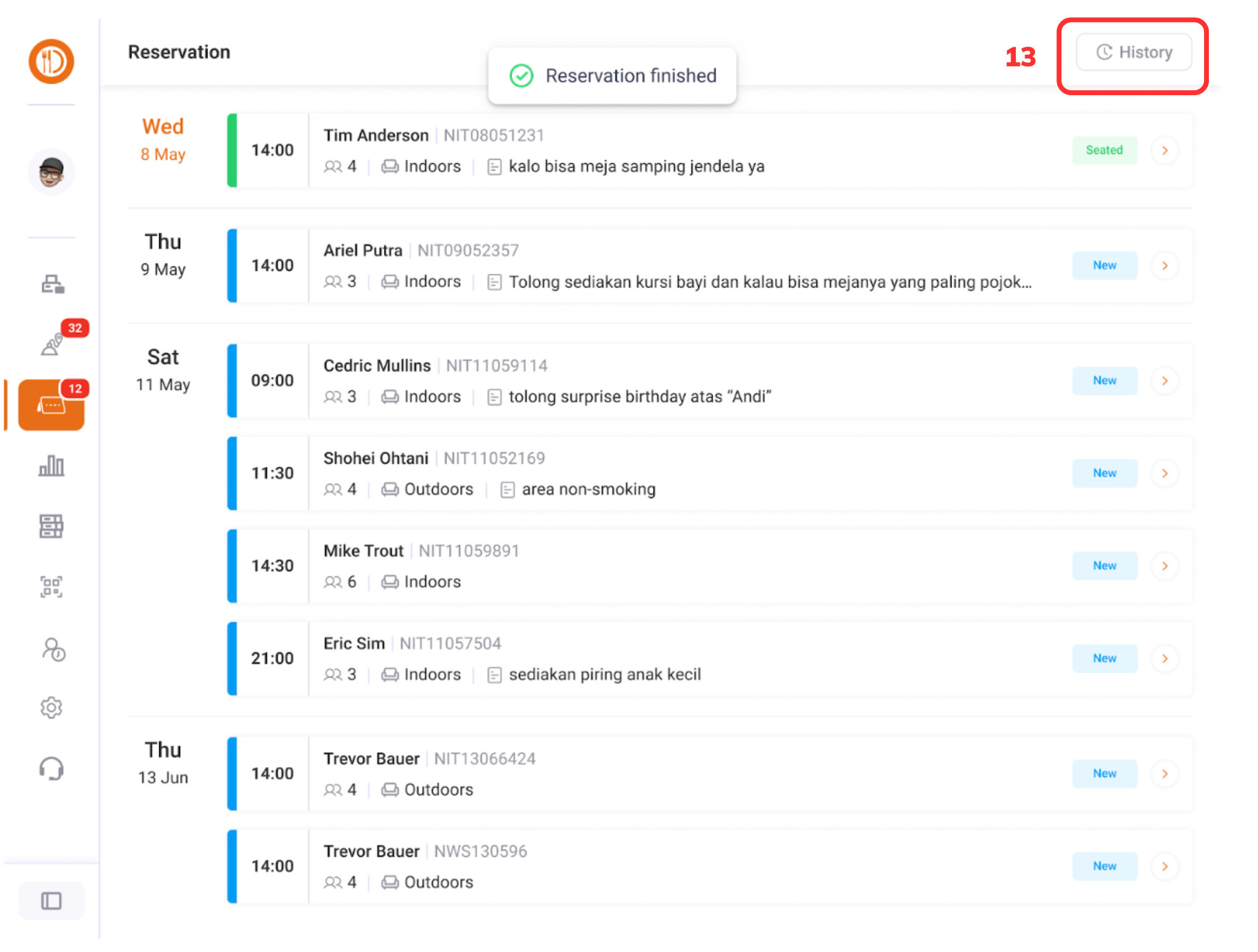 Reservasi selesai dan Merchant dapat melihat detail reservasi yang sudah selesai dengan memilih “History (13)”