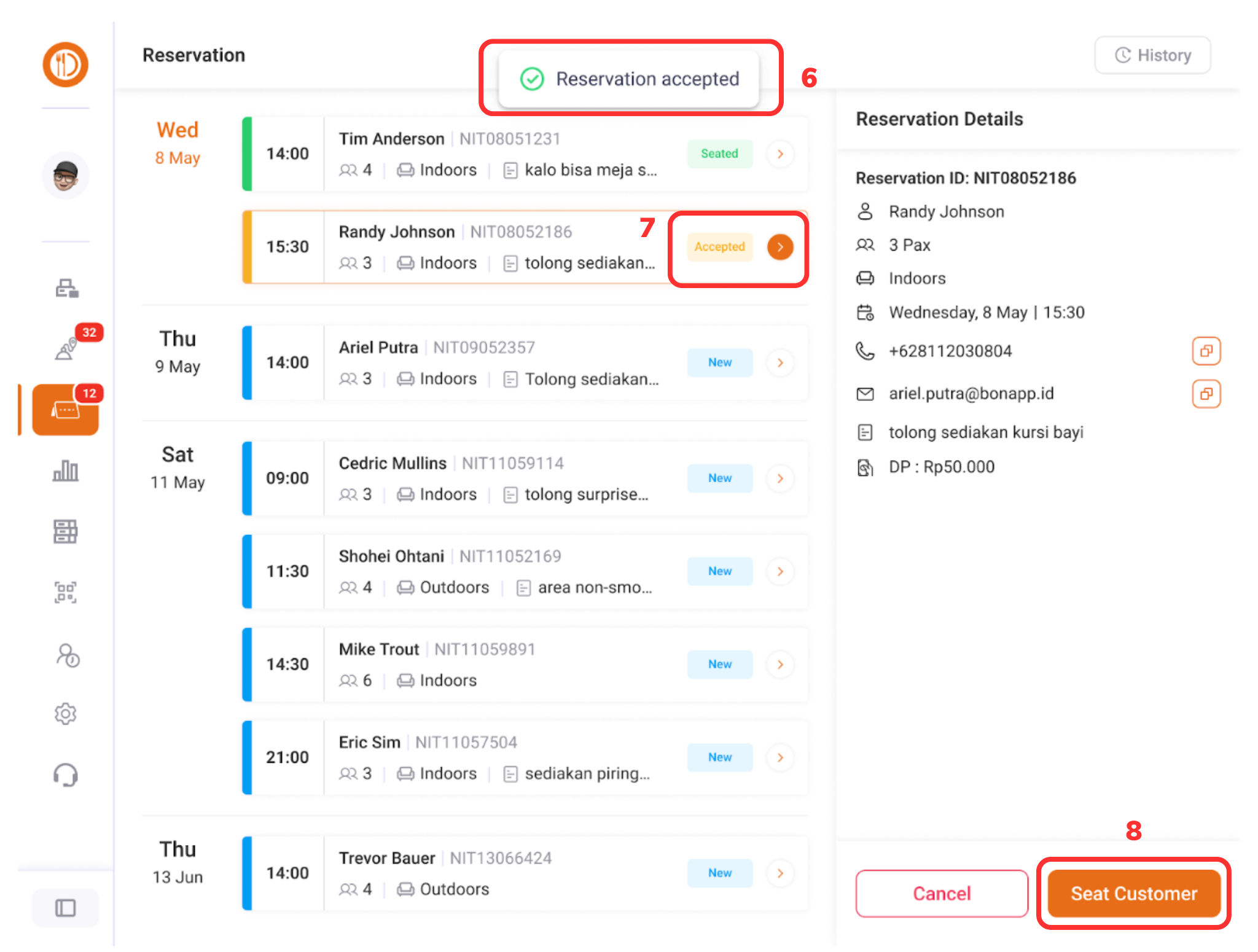Jika reservasi berhasil diterima, akan muncul notifikasi “Reservation Accepted (6)”. Lalu, status pada daftar akan berubah menjadi “Accepted (7)”. Jika customer sudah datang pada waktu reservasi yang dipesan, Anda dapat mengklik tombol “Seat Customer (8)”.
