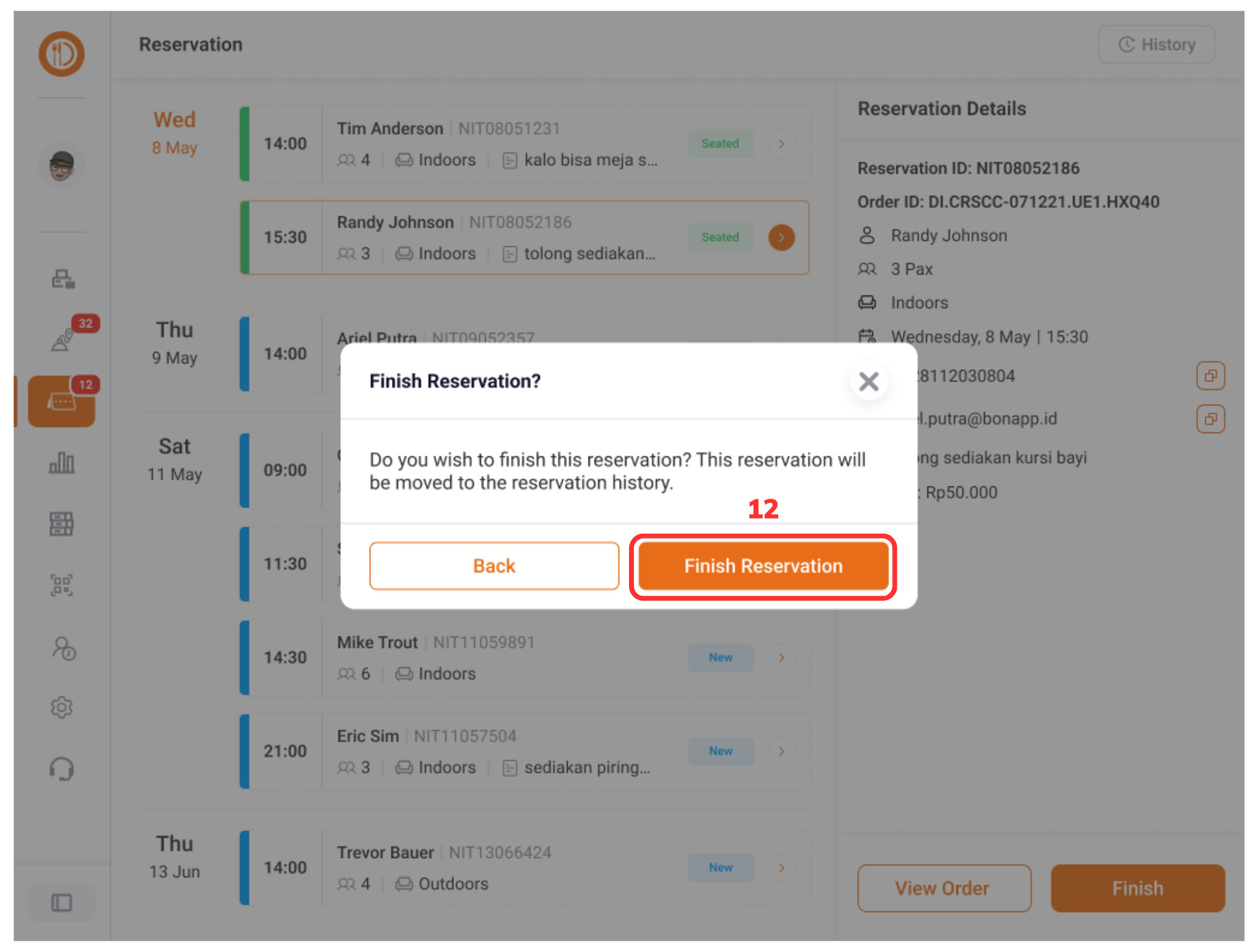Jika reservasi telah selesai Merchant dapat memilih “Finish (11)”, akan muncul pop up konfirmasi lalu pilih “Finish Reservation (12)”