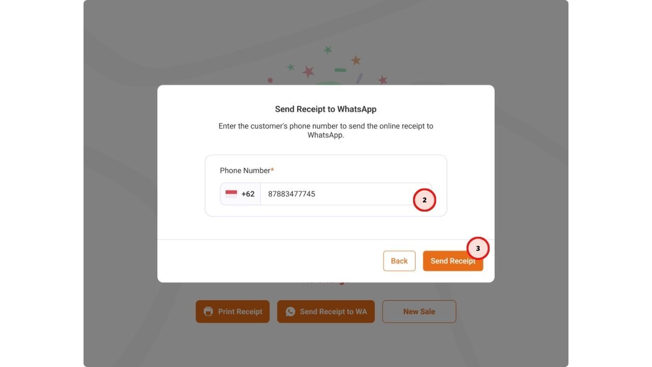 Selanjutnya, masukan nomor whatsapp pelanggan (2) pada kolom phone number. Lalu, pilih Send Receipt (3).