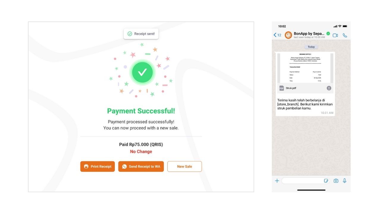 Fitur baru yang mengirimkan struk transaksi dalam format PDF langsung ke WhatsApp pelanggan setelah pembayaran berhasil — ramah lingkungan, praktis, dan mudah dibagikan tanpa perlu cetak fisik.