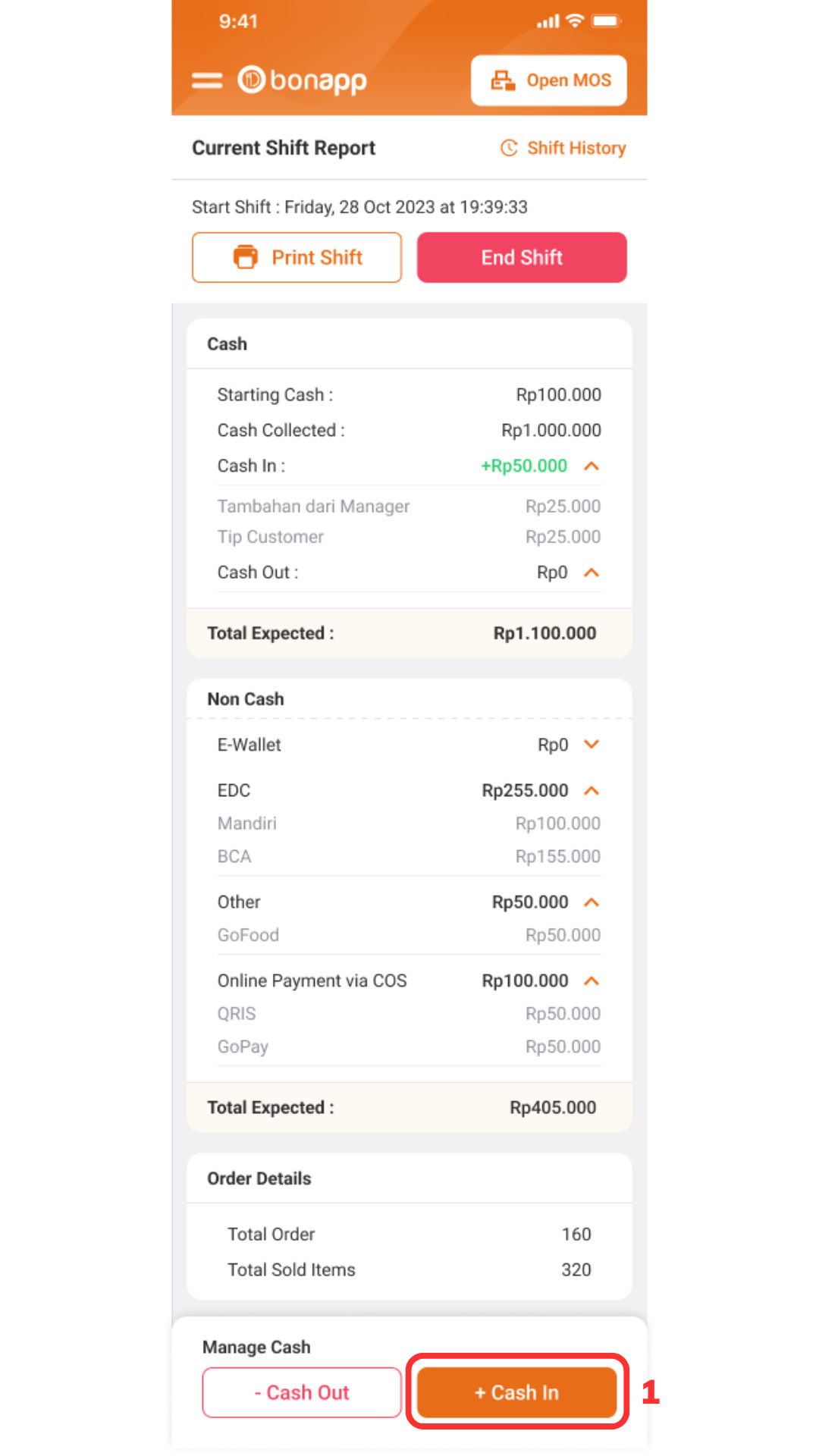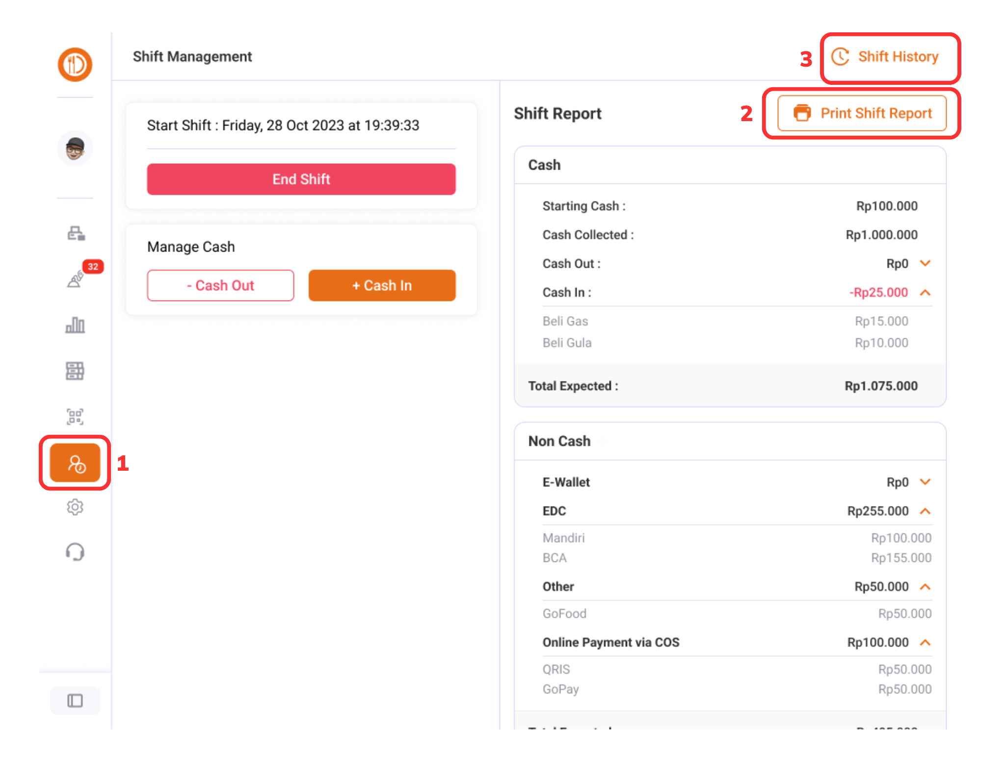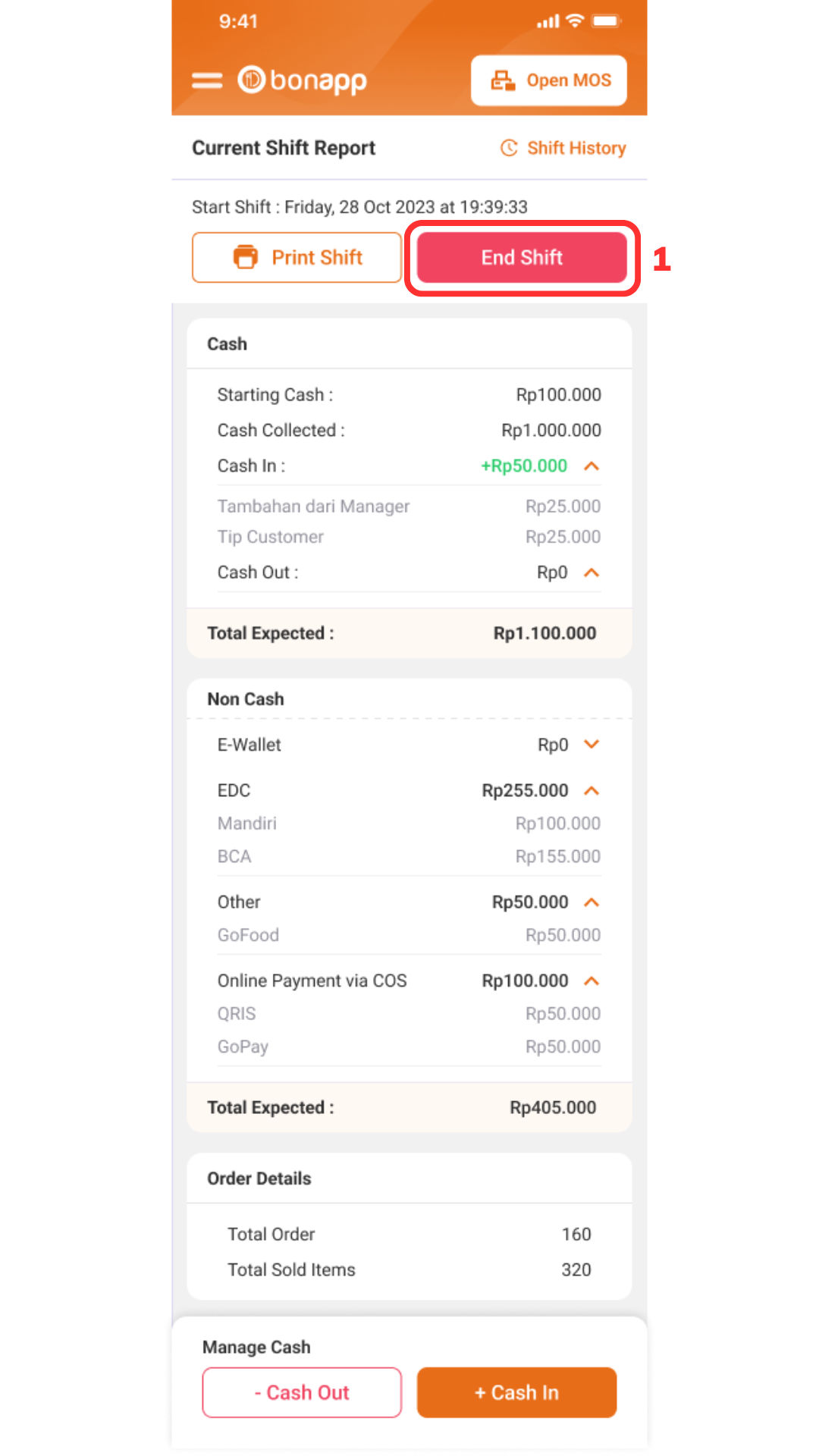 Pilih halaman “Shift” > “End Shift (1)”.