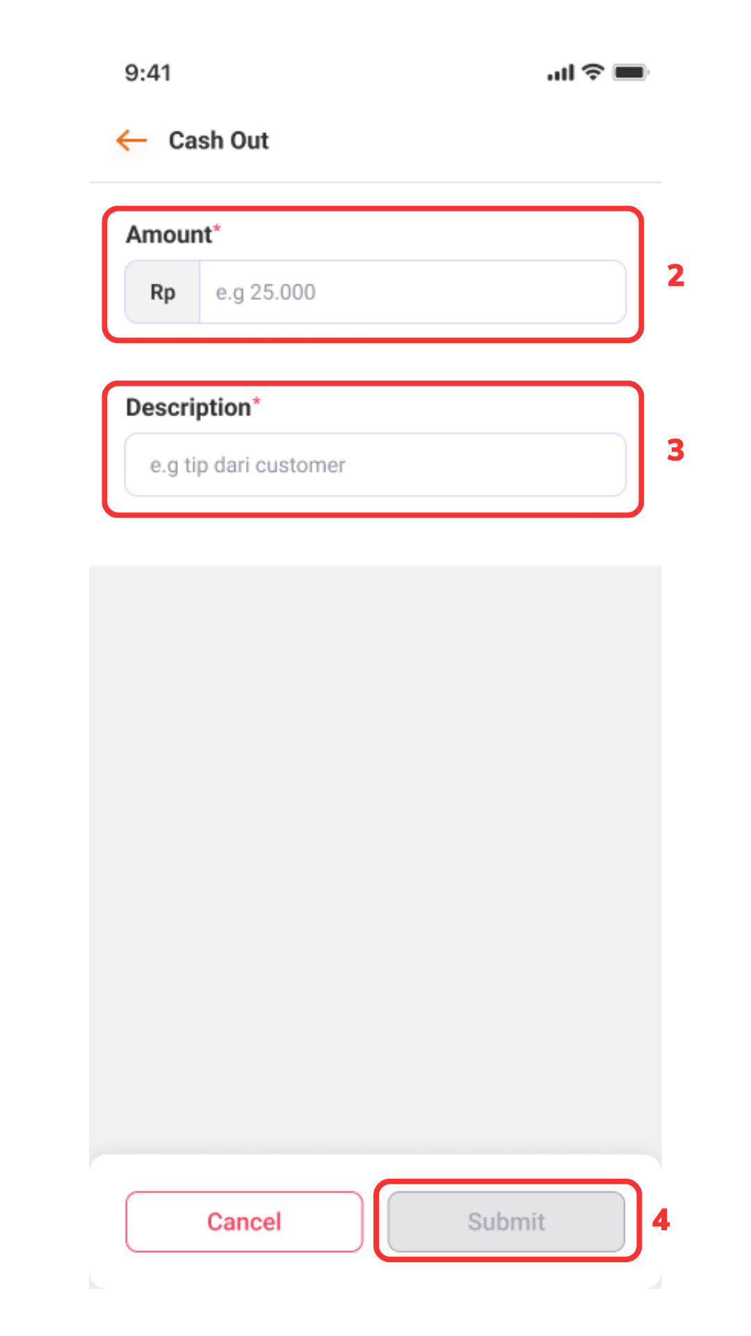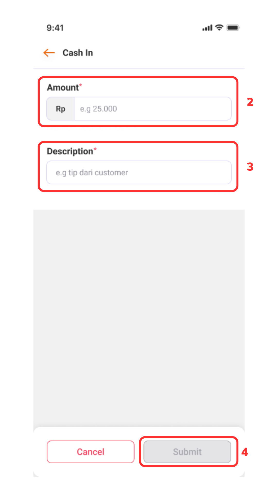 Masukkan nominal pada Amount (2) > Masukkan description (3) > “Submit (4)”.