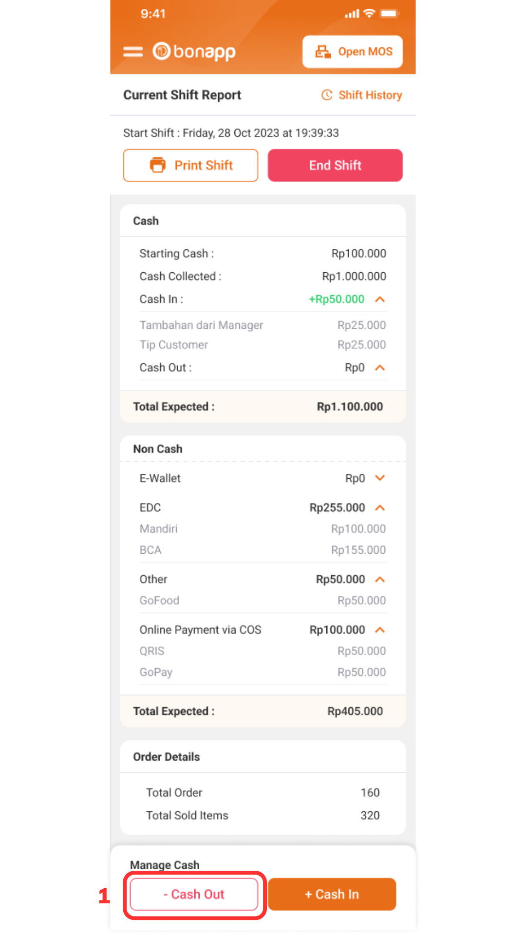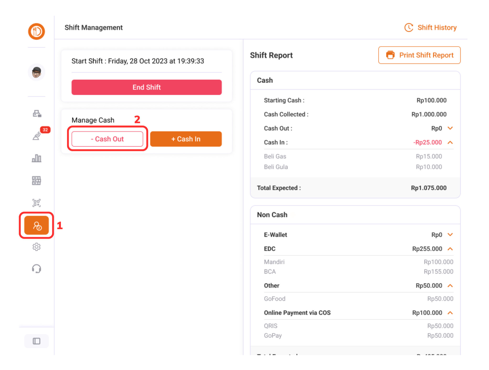 Pilih halaman “Shift” > “Cash Out (1)”.