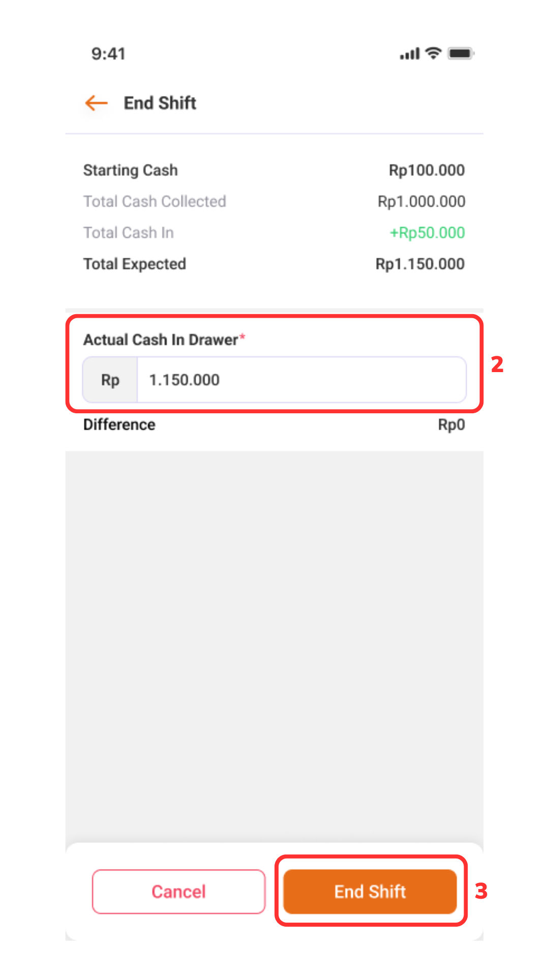 Masukkan nominal Actual Cash in Drawer (2)” > “End Shift (3)”.