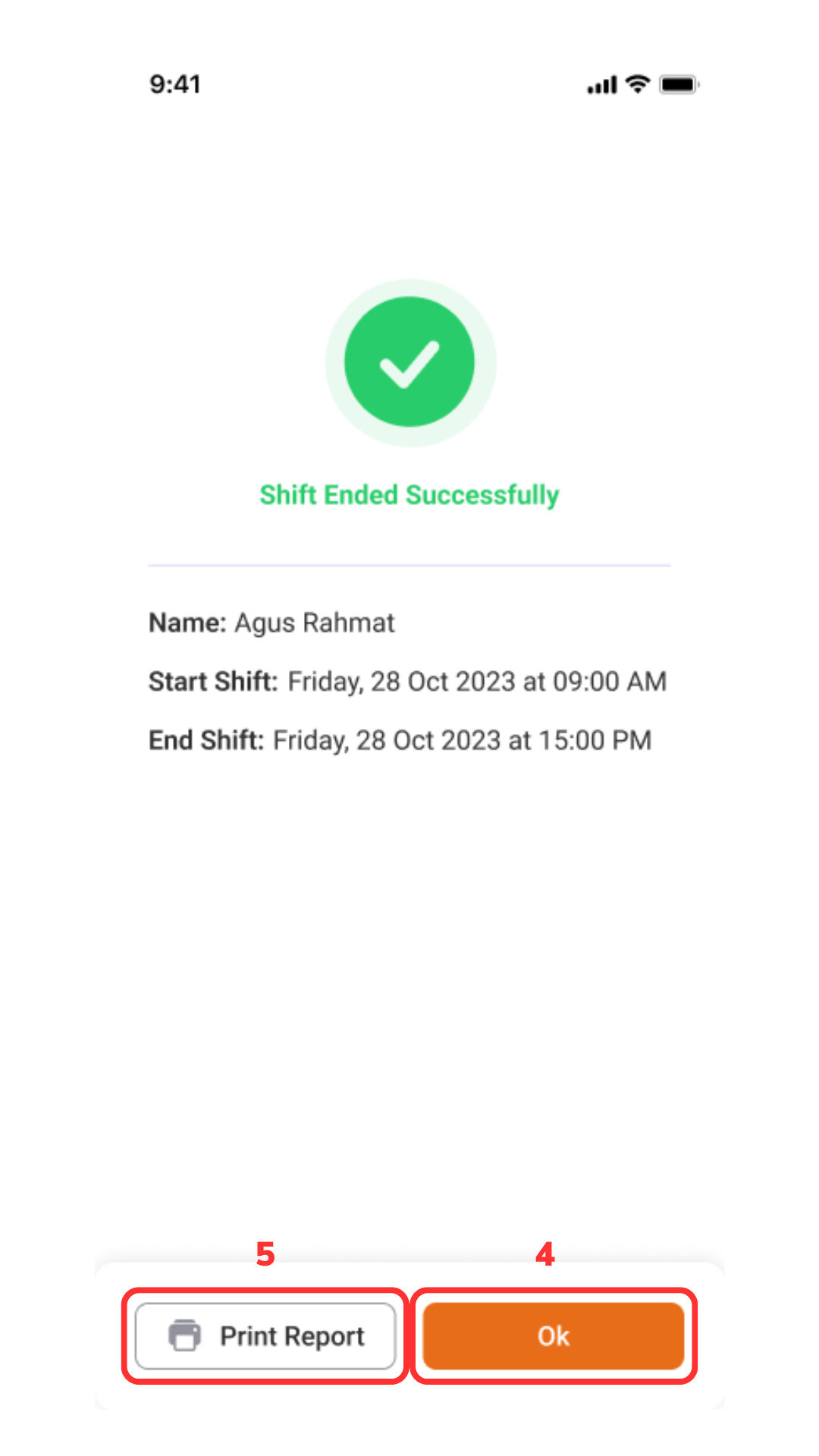 Pilih OK untuk menyelesaikan (4) dan Pilih Print Report untuk Print Shift (5).