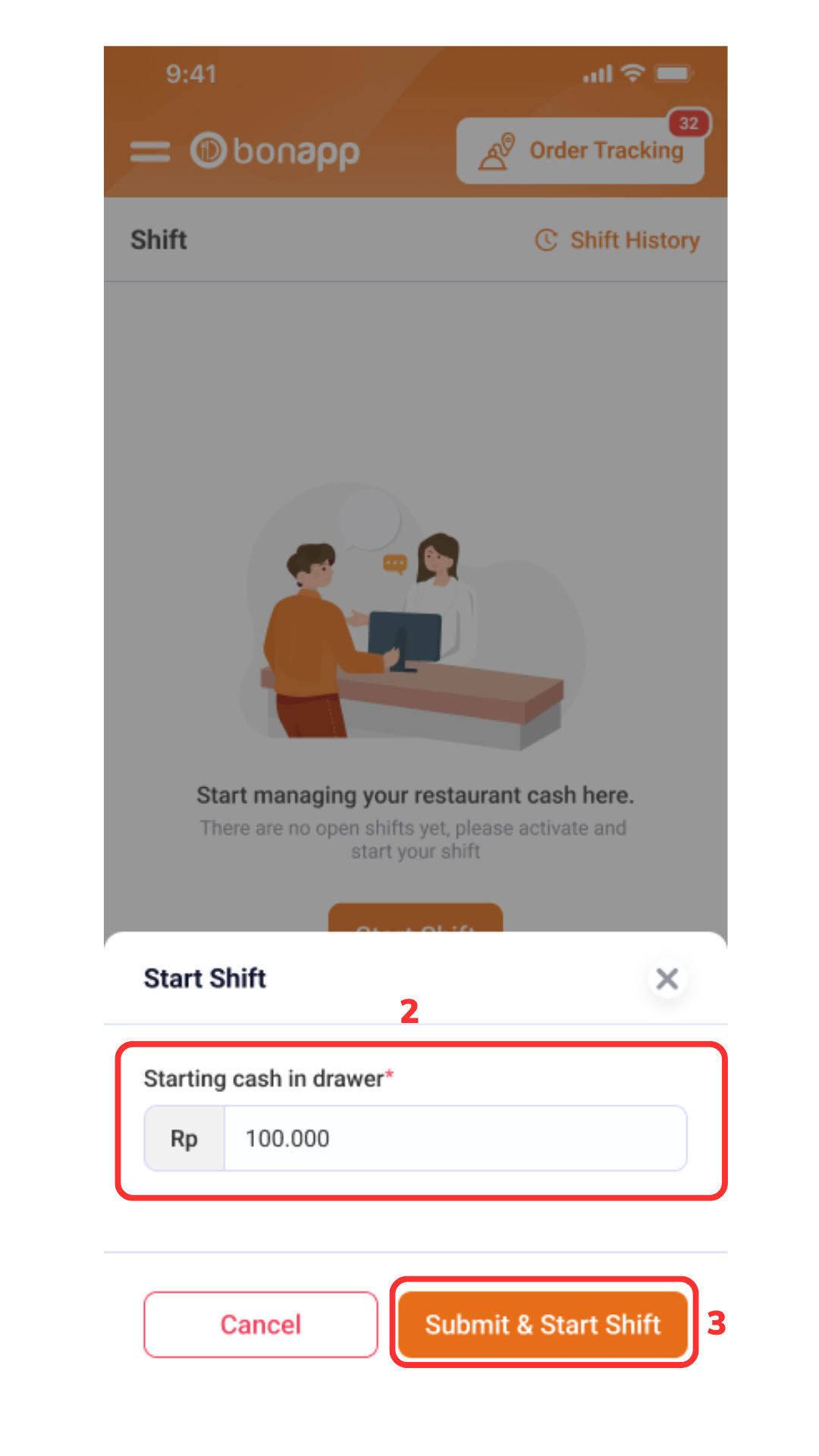 Masukkan nominal yang ada pada drawer (2) > “Submit & Start Shift (3)”.