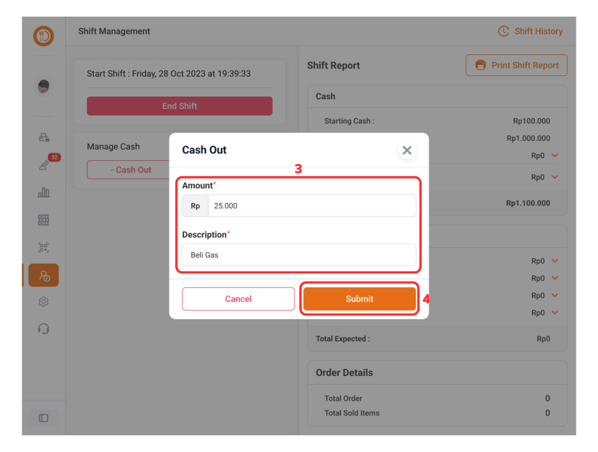 Masukkan nominal yang ada pada drawer (3) > “Submit & Start Shift (4)”.