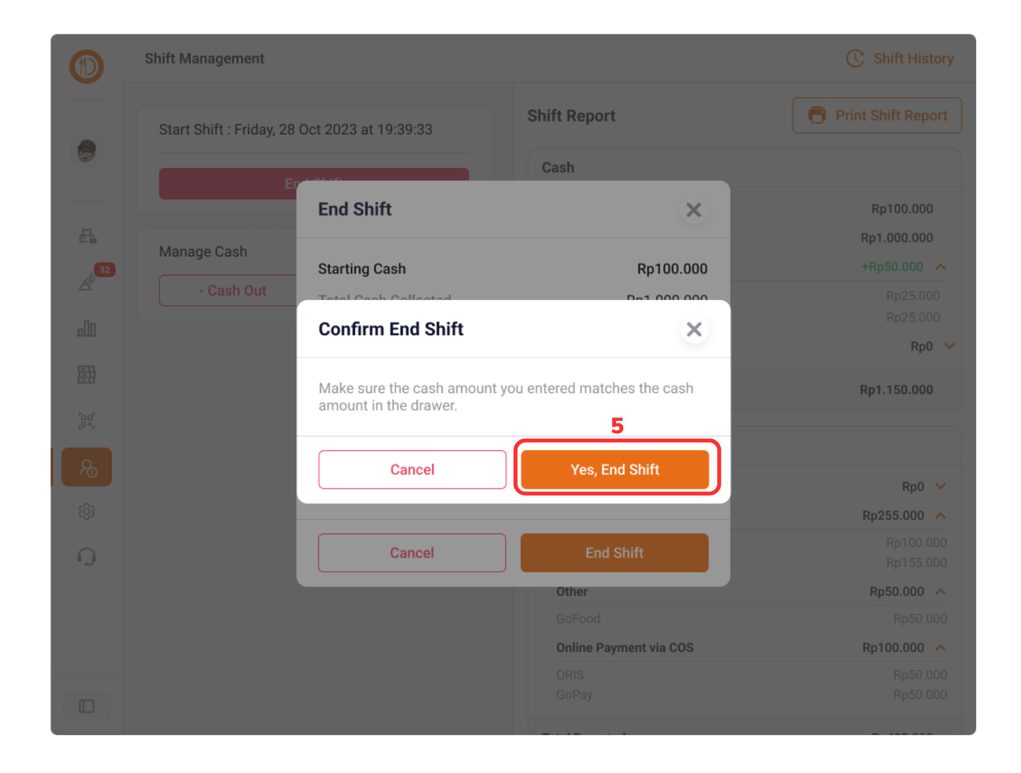Lakukan konfirmasi end shift dengan menekan tombol “Yes,End shift”(5).