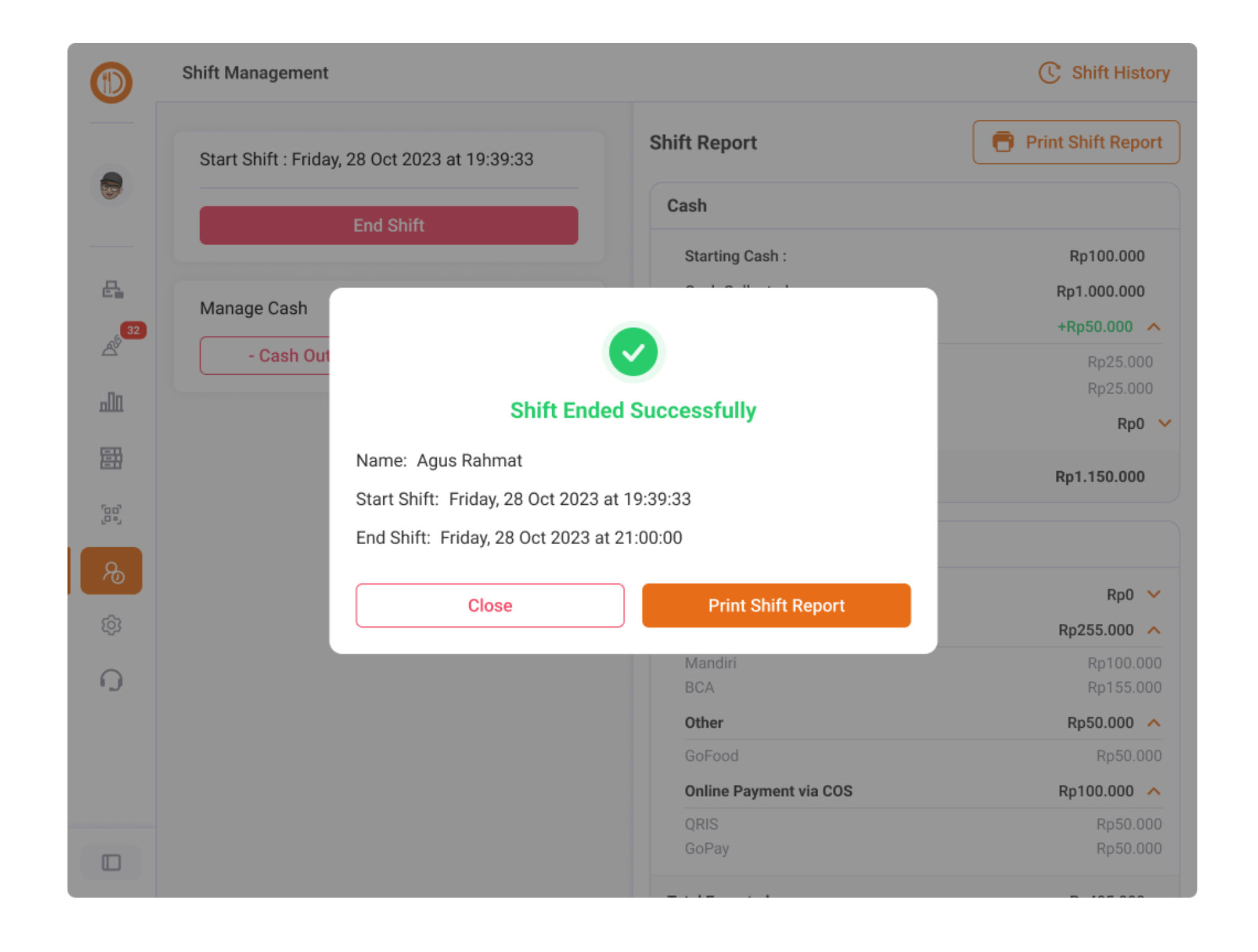 Anda akan mendapatkan konfirmasi End Shift berhasil.