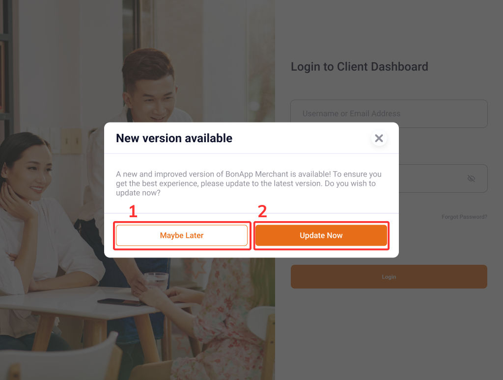Notifikasi software update akan tampil ketika aplikasi BonApp terdapat pembaruan (update), namun pada kondisi ini Anda diwajibkan melakukan pembaruan aplikasi (update) sekarang juga.
