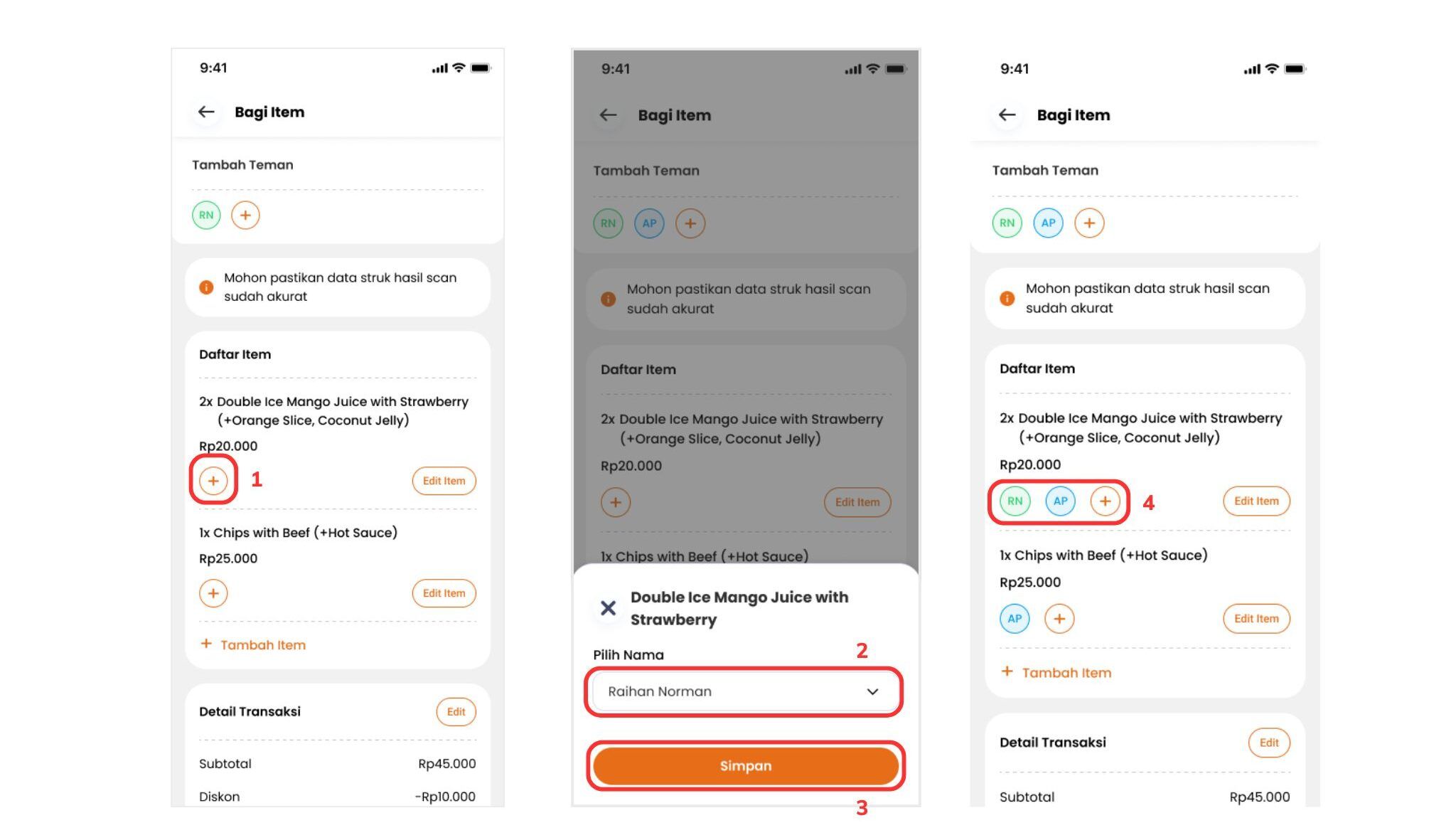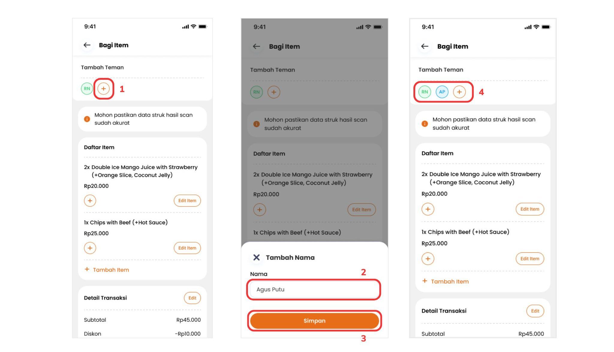 Pada halaman Bagi Item, pilih + pada menu Tambah teman (1). Isi nama teman yang ingin ditambahkan pada kolom (2) tambah teman, lalu pilih simpan (3). Teman berhasil ditambahkan (4).
