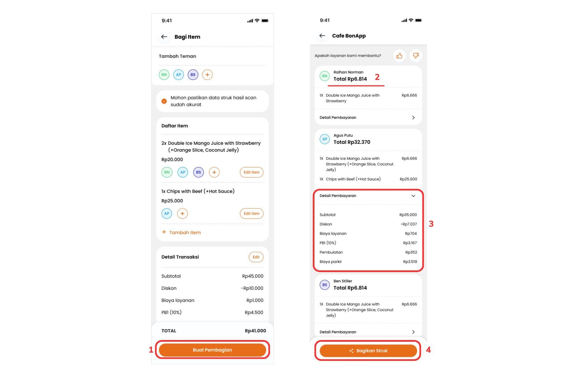 Pada halaman Bagi Item, pilih Buat Pembagian (1). Setelah itu akan muncul jumlah nominal pembagian setiap orang (2) dan detail pembayarannya (3). Lalu, pilih Bagikan Struk (4) untuk membagikan perhitungan ke teman-teman, Anda bisa membagikan via WhatsApp atau copy link.