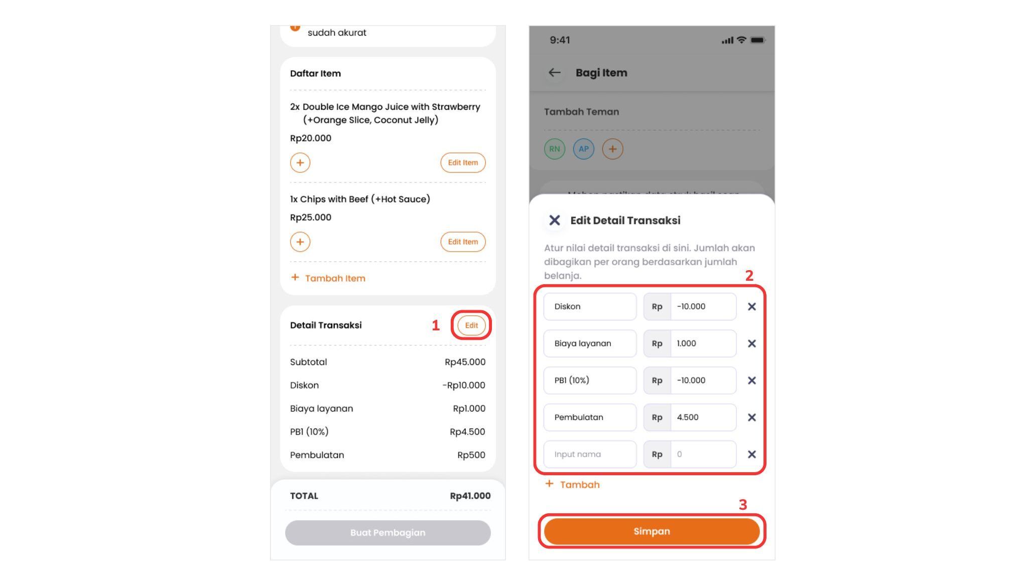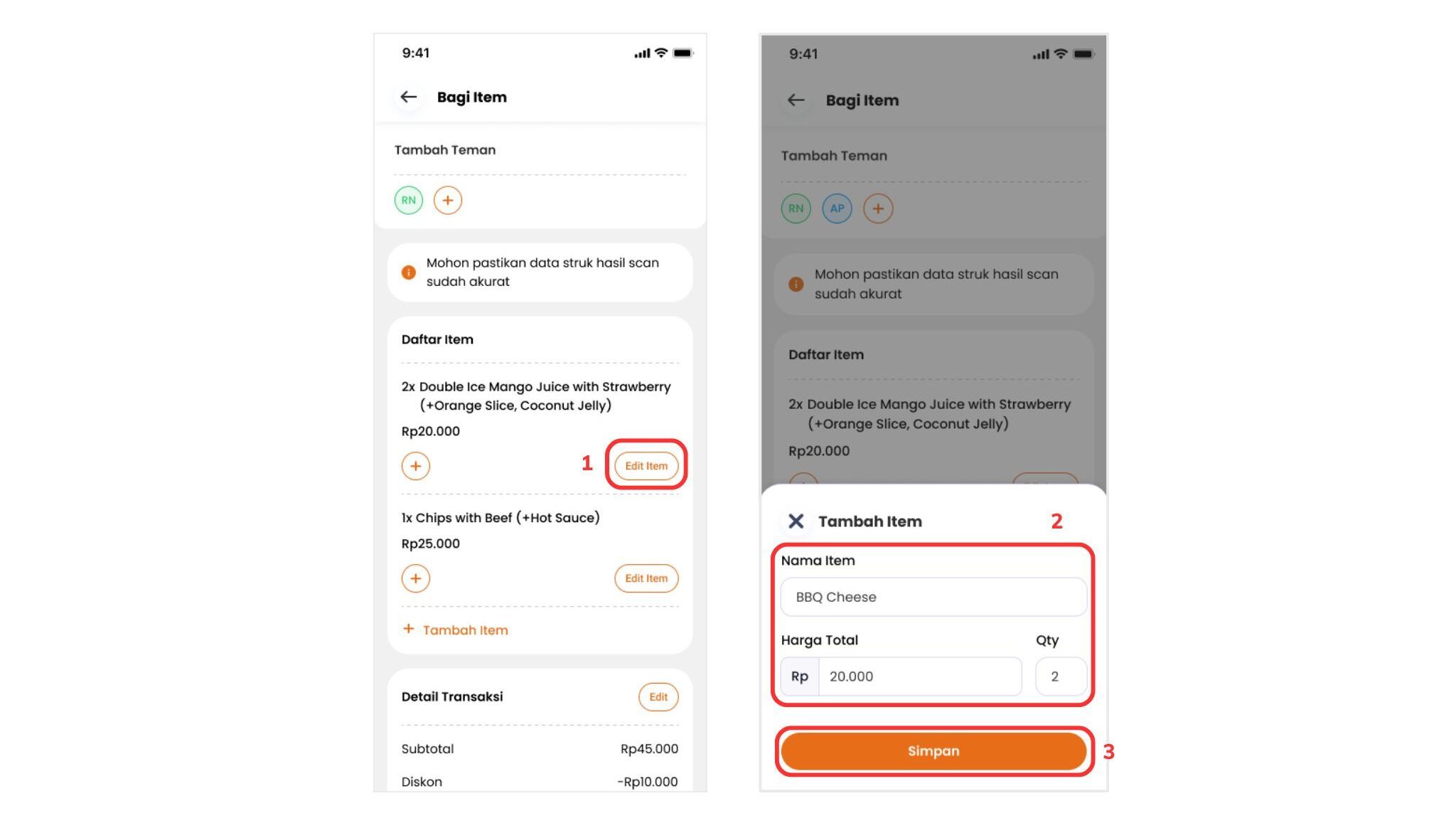 Pada halaman Bagi Item, pilih Edit pada menu Detail Transaksi (1). Atur detail transaksi (nama, harga) pada kolom yang muncul (2), lalu pilih simpan (3). Item berhasil ditambahkan.