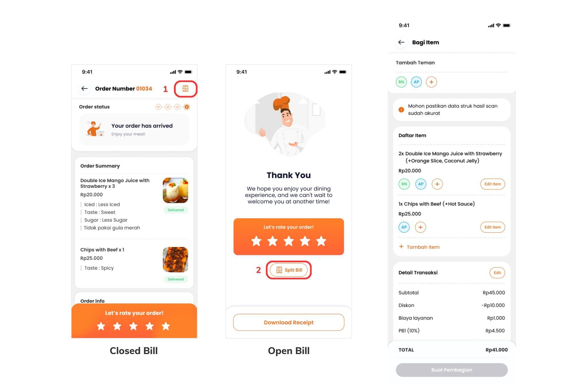 Untuk pesanan Closed Bill, menu Split Bill dapat diakses di halaman Order Details dan pilih Split Bill (1). Untuk pesanan Open Bill, menu Split Bill (2) dapat diakses di halaman Thank You. Jika diakses dari COS, semua item sudah langsung ada di halaman Split Bill.