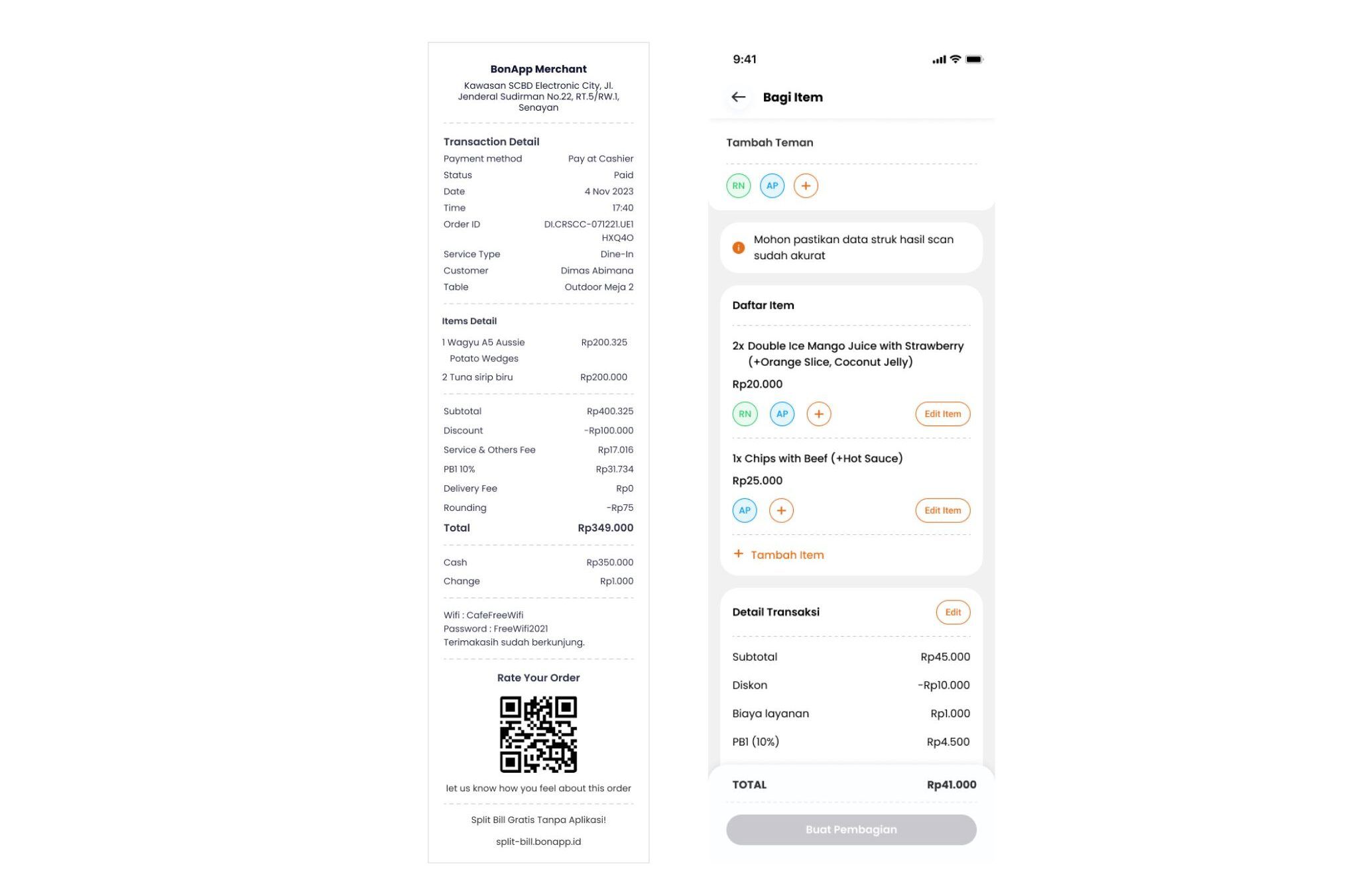 Fitur Split Bill dalam bentuk web app dibuat untuk memudahkan pelanggan membagi tagihan secara digital dengan teman-teman mereka. Cukup pindai struk, pilih item yang ingin dibagi, dan kirim hasilnya—semua tanpa perlu mengunduh aplikasi. Fitur ini tidak hanya praktis, tapi juga jadi cara kami memahami kebutuhan konsumen lebih baik demi pengembangan layanan yang lebih relevan di masa depan.