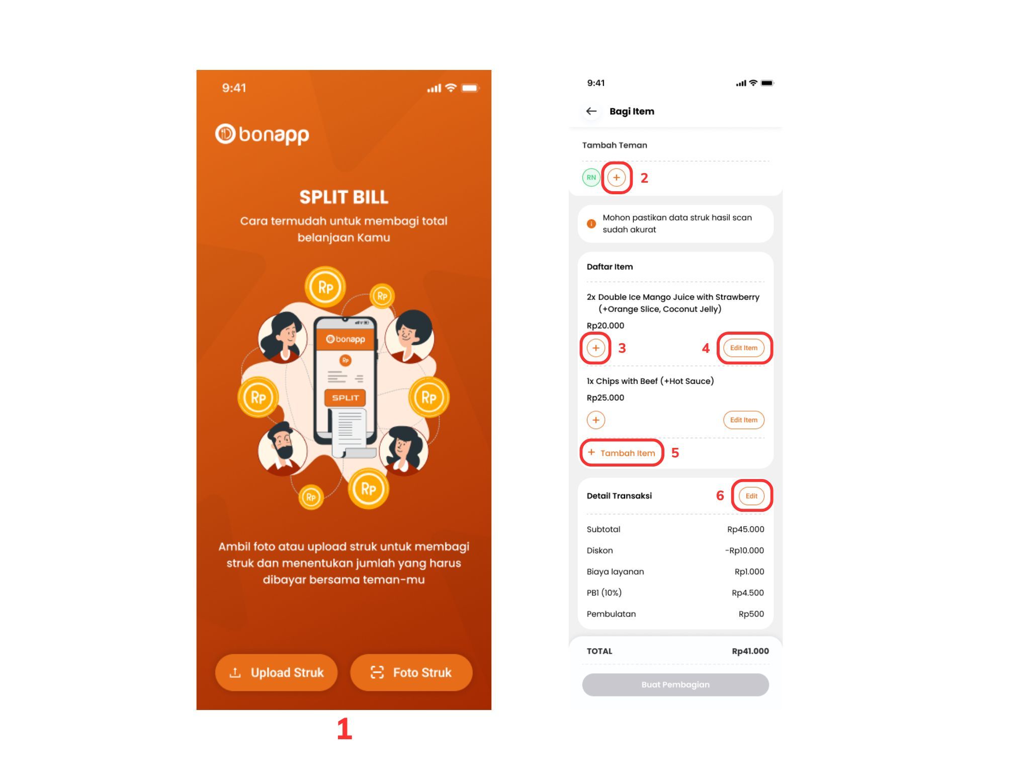 Pada menu Daftar Item, Pilih + (3) untuk assign item ke orang yang sudah ditambah atau pilih Edit Item (4) untuk mengedit (nama, jumlah, harga). Bisa juga pilih + Tambah Item (5) untuk menambah item baru. Pada menu Detail Transaksi, Anda dapat memilih Edit (6) untuk mengedit detail transaksi (nama, harga).
